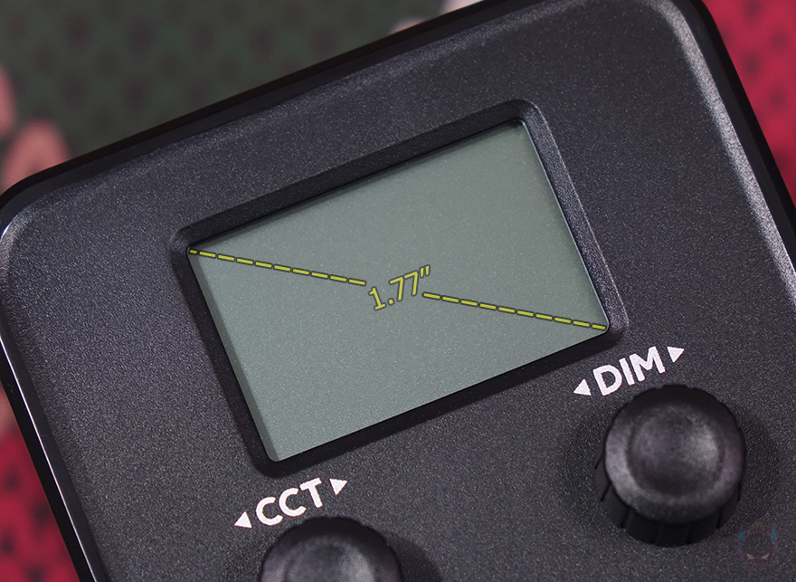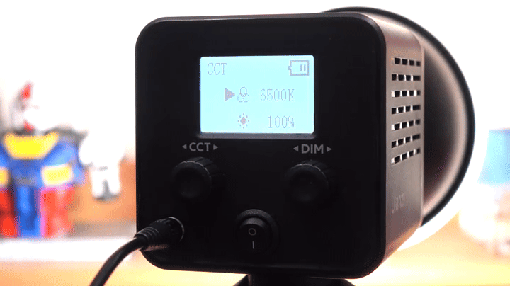 그리고, 본체 후면에는 작동상태를 확인할 수 있는 약 1.77인치 크기의 디스플레이 화면이 적용되어 있으며, 바로 아래에는 2개의 노브(Knob) 컨트롤러 적용되어 있는데, 왼쪽(CCT)은 노브와 버튼 2가지 역할로 노브로 사용할 때는 색온도조절, 버튼으로 사용할 때는 모드변경으로 앞서 제품설명서에서 확인했듯이는 모드는 총 8가지를 갖추고 있습니다. 그리고, 오른쪽(DIM) 노브는 밝기조절 기능을 가졌죠. 또한, 아래 중간에는 전원 스위치가 배치되어 있으며, 왼쪽에는 전원어댑터와 연결되는 전원 포트가 적용되어 있는데, 조금 아쉬운 점이라면 배터리가 내장된 제품이라 DC 포트보다 USB Type-C 방식이었으면 더 좋지 않았을까 생각합니다.