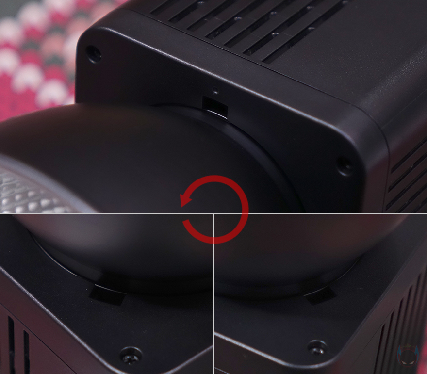 그럼, 본격적으로 Ulanzi(울란지)의 LT028 COB 조명을 살펴보는데, 전체적인 디자인은 일반 촬영조명 제품과 큰 차이가 없습니다. 전면에는 반사경(Reflector)이 적용되어 있는데, 안쪽을 보면 COB LED가 적용된 것을 쉽게 확인할 수 있죠. 물론, 반사경은 분리도 가능한데, 시계 반대방향으로 돌리면 쉽게 분리가 되죠. 반사경 입구의 직경은 약 105mm이며, COB LED 주변에는 발열해결을 위해 360˚ 범위로 방열판(Heatsink)이 적용되어 있습니다. 참고로, 앞서 제품 설명서에서 확인했듯이 COB LED의 색온도 범위는 2500~6500K이고, 100% 설정에서의 조도 밝기는 13260 Lux(디퓨저사용)입니다.