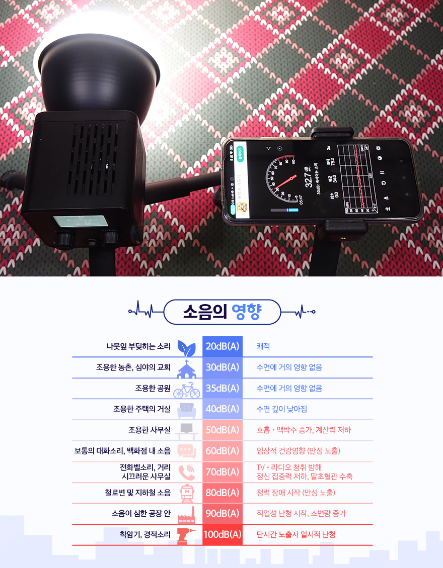 끝으로, LT028는 COB LED 방식이라 앞서 확인했듯이 주변에 발열해결을 위해 방열판이 적용되어 있습니다. 물론, 내부에는 팬도 적용되어 있습니다. 그래서, COB 조명 특성상 소음이 발생할 수밖에 없는데, LT028의 최대 설정값(6500K/100%) 상태에서 약 5cm 거리를 두고 소음 측정을 해 본 결과, 약 32dB(A) 수준으로 실내 정숙한 소음과 비슷한 수준이라 사용하면서 소음에 대한 불만은 없겠습니다. 또한, 전원어댑터를 사용한 충전 같은 경우에는 충전 시 배터리 잔량상태를 실시간으로 표시해 주며, 조명을 사용하면서도 충전할 수 있습니다.
