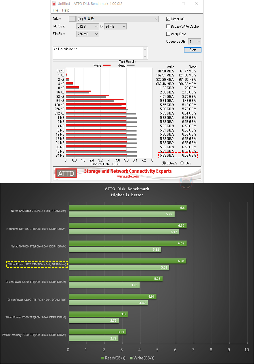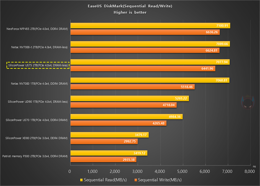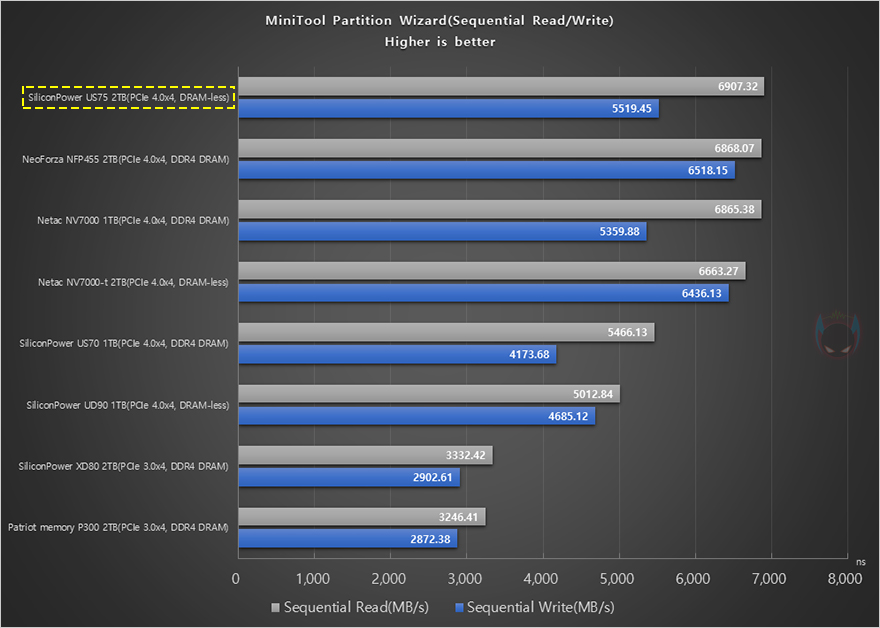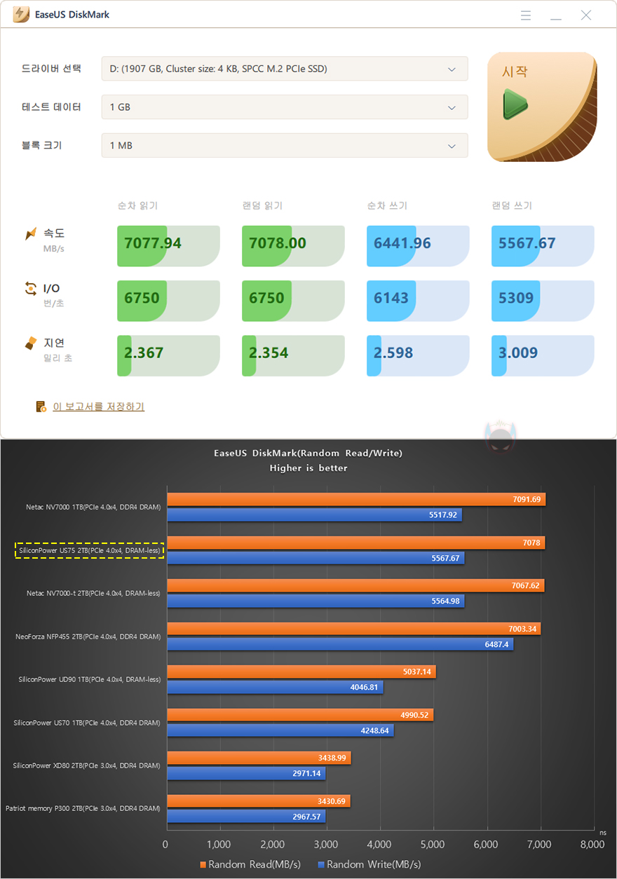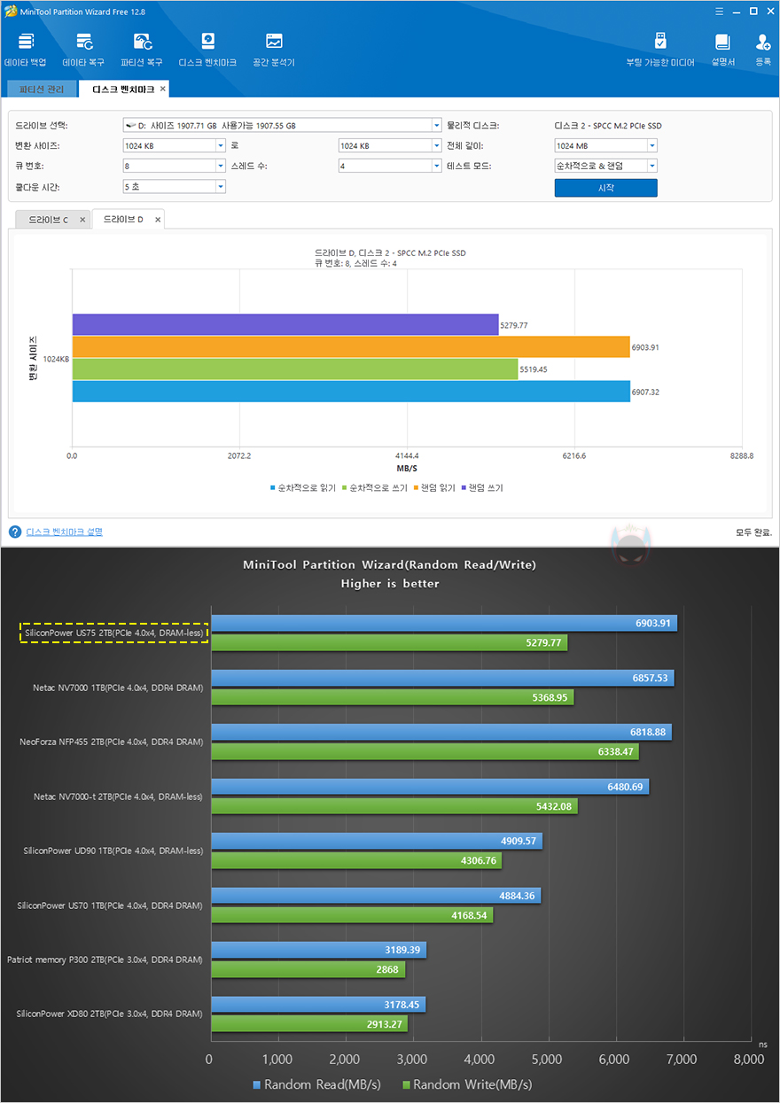 이밖에 좀 더 추가적인 벤치마크 프로그램들로 US75 NVMe SSD의 성능을 확인해보면, 상대적으로 CrystalDiskMark보다는 조금 낮은 수치로 나오는 ATTO Disk Benchmark에선 동일한 규격 그러니깐 PCIe 4.0x4 규격의 다른 비교 SSD 제품들과 읽기 속도는 비슷한 수준으로 나왔으며, 쓰기 속도는 적용된 컨트롤러칩셋의 사양보다 조금 낮게 나왔습니다. 이외에도 EaseUS DiskMark나 MiniTool Partition Wizard 벤치마크 프로그램에서도 결과는 비슷했습니다. 전반적으로 읽기 속도는 적용된 PCIe 4.0x4 규격에 최대 속도에 근접했으며, 쓰기 속도는 조금 낮은 편이었는데, 그래도 먼저 나왔던 자사의 동일한 규격의 US70 모델보다는 컨트롤러칩셋이 바뀌면서 나은 속도를 보여줬고, 디램리스 제품치고는 역시 캐시 기술로 보완해 쓰기 속도를 상급 수준으로 보완해 준다라는 것을 확인할 수 있었습니다.