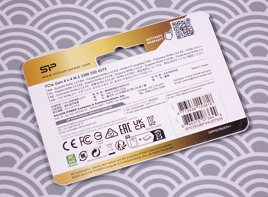 제품 패키지는 실리콘파워 기존의 SSD 제품들처럼 액세서리 포장형식의 캡-방식으로 개봉을 하지 않고도 외부에서 제품 실물을 바로 확인할 수 있습니다. 패키지에는 모델명과 용량 표기, 그리고 5년 보증기간(Warranty) 표기와 함께 제품의 읽기와 쓰기 속도까지 한눈에 확인할 수 있죠. 그리고, 패키지 후면에는 상품등록을 할 수 있게 QR코드를 담고 있으며, 홈페이지 안내문구도 한국어를 포함해 다국적 언어로 표기해 놨습니다. 제품 구성은 기존 제품들과 마찬가지로 SSD 본제품 외에는 다른 구성품은 없습니다.