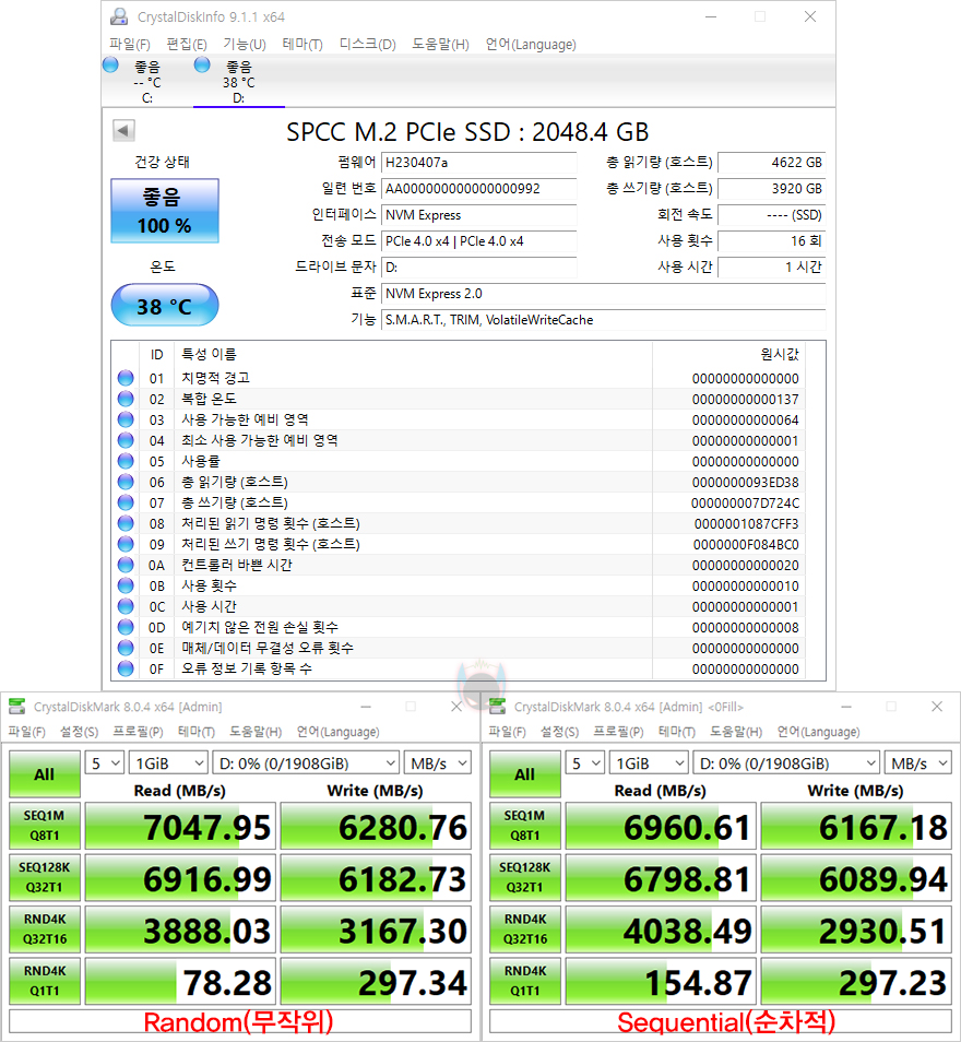 직접, 실리콘파워(SiliconPower) US75 NVMe SSD를 사용해보면, 일단 US75 모델 같은 경우 용량은 500GB, 1TB, 2TB, 4TB 4가지로 출시되었는데, 2TB 모델부터는 앞서 확인한 컨트롤러 칩셋의 최대 읽기/쓰기 속도를 가집니다. 그래서, 리뷰에선 2TB 용량 모델이 사용되었으며, 간단하게 CrystalDiskInfo 프로그램을 통해 PCIe 4.0x4 규격과 TRIM 기술, 그리고 디램리스 SSD이기 때문에 쓰기 속도를 보완해 주는 VolatileWriteCache가 적용된 걸 확인할 수 있죠. 또한, 제조사들이 스펙상 속도 측정으로 많이 사용되는 CrystalDiskMark를 통해서 US75 NVMe SSD의 읽기와 쓰기 속도를 측정해 보면, 랜덤(Random)과 순차적(Sequential) 접근모두 스펙상의 속도에 근접하게 나오는 걸 확인할 수 있습니다.