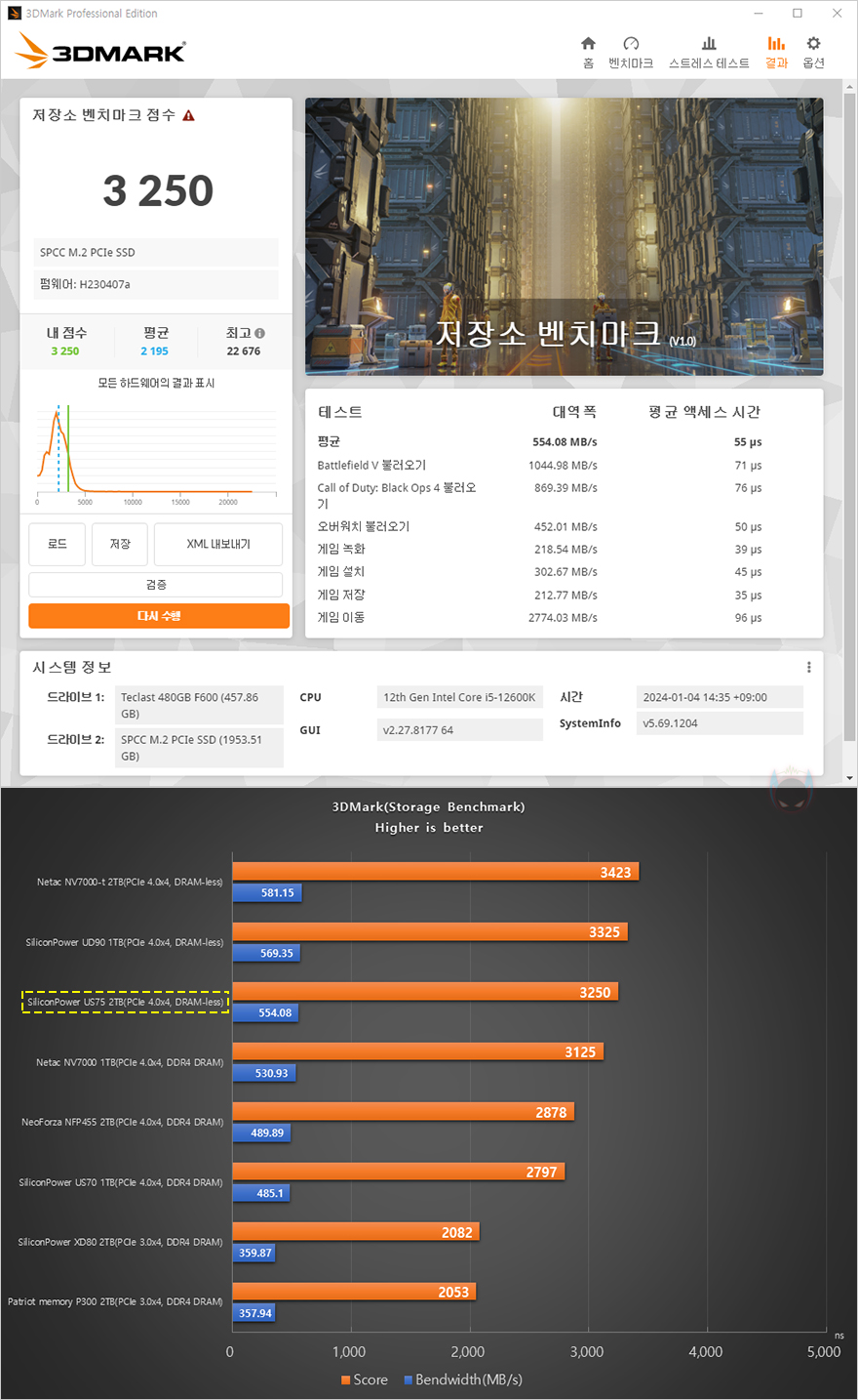 끝으로, 스코어 점수로 보여주는 Passmark의 PerformanceTest와 전체 시스템으로 게임시 로딩속도 실사용을 가늠할 수 있는 3DMark 저장소 벤치마크를 통해서도 PCIe 4.0x4 규격답게 동일한 규격의 다른 비교 SSD와 비슷한 성능을 보여줬으며, 디램리스 SSD라는 점을 감안하면 역시 실사용에서도 성능은 충분히 만족스러울 수 있는 제품이라 생각됩니다.