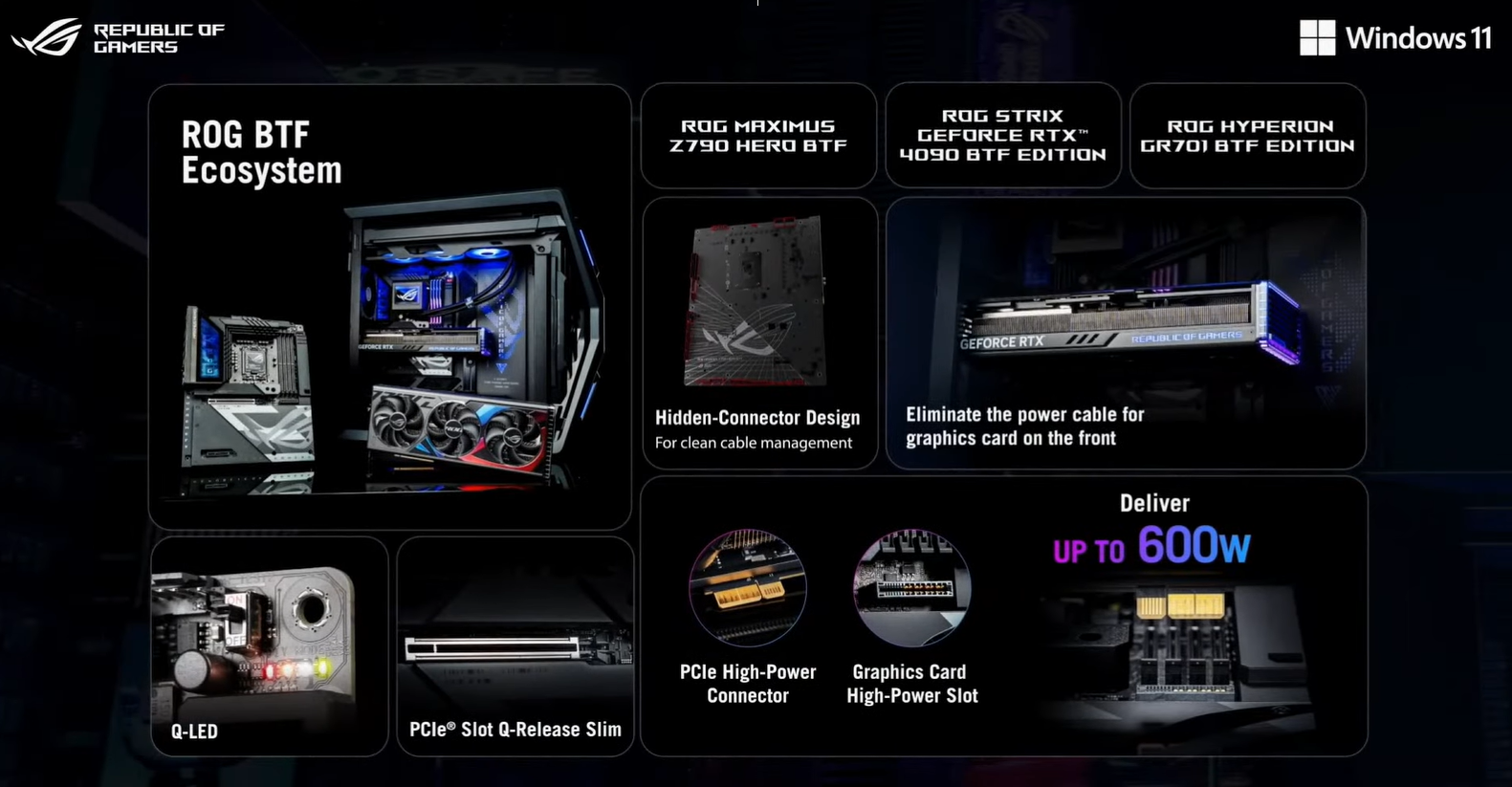 한국시간으로 오늘 1월 9일부터 미국 라스베가스에서 열리는 세계 최대 IT 박람회 CES에서 ASUS는 데스크탑 PC 제품부터 노트북, 스마트폰까지 대거 신제품을 공개했다. 특히, PC 제품군에서는 작년 컴퓨텍스에서 처음 선보였던 BTF(Back-To-The-Future) 제품군을 TUF Gaming 라인업에 이어 이번에 ROG 라인업으로도 공개를 했는데, 기존의 ROG 하이페리온 GR701 PC케이스부터 막시무스 Z790 히어로 메인보드, 스트릭스 지포스 RTX4090 그래픽카드를 모두 BTF 버전으로 새롭게 공개했다. 특히, 메인보드는 BTF 콘셉트에 맞춰 케이블 커넥터를 모두 메인보드 후면에 배치했으며, 그래픽카드 슬롯부분에만 바로 옆에 보조전원 슬롯을 배치해, BTF 그래픽카드의 전력공급이 되도록 했는데, 600W이상 지원한다.