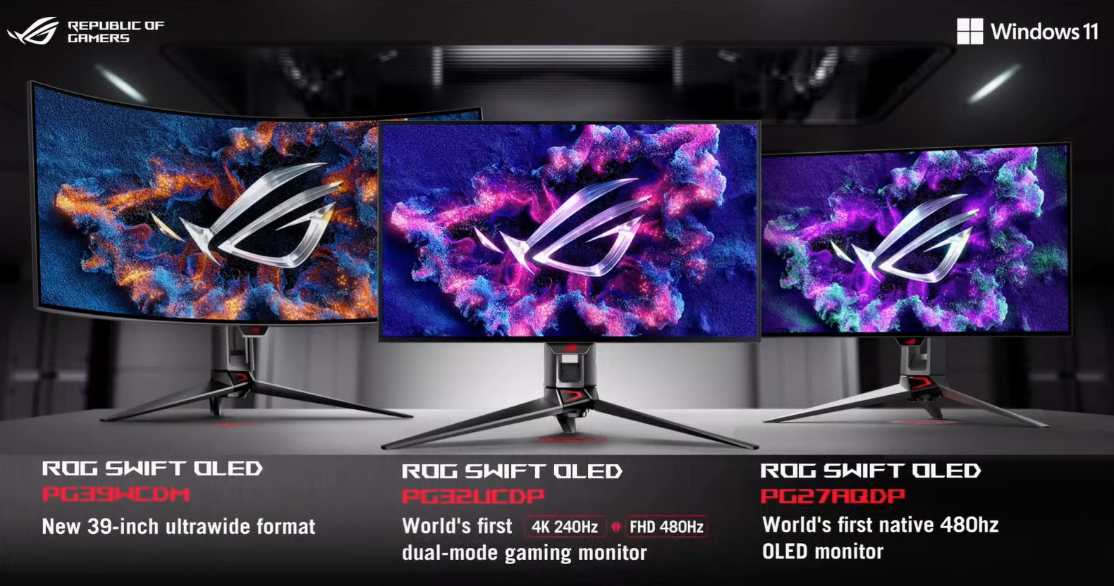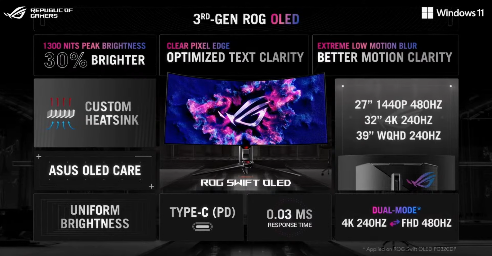 이 외에도 모니터 제품도 이번 CES 디스플레이의 핫이슈인 OLED로 ROG 게이밍 모니터를 선보였는데, 이미 ASUS는 그전에도 OLED 모니터 일부를 선보였기때문에, 이번에 선보인 ROG OLED 게이밍 모니터는 3세대에 속한다. 크기는 39인치, 32인치, 27인치 3가지 모델로 39인치는 울트라 와이드에 커브드 모니터이며, 해상도는 3440x1440, 주사율은 240Hz을 지원한다. 32인치와 27인치는 평면 모니터이며, 32인치는 4K@240Hz, 풀-HD에선 480Hz 주사율을 지원하며, 27인치는 QHD에 480Hz 주사율을 지원한다. 이밖에 모니터 액세서리 제품으로 ROG Aura Sync 연동이 되는 모니터 조명바와 모니터 암 제품도 처음으로 선을 보였다.