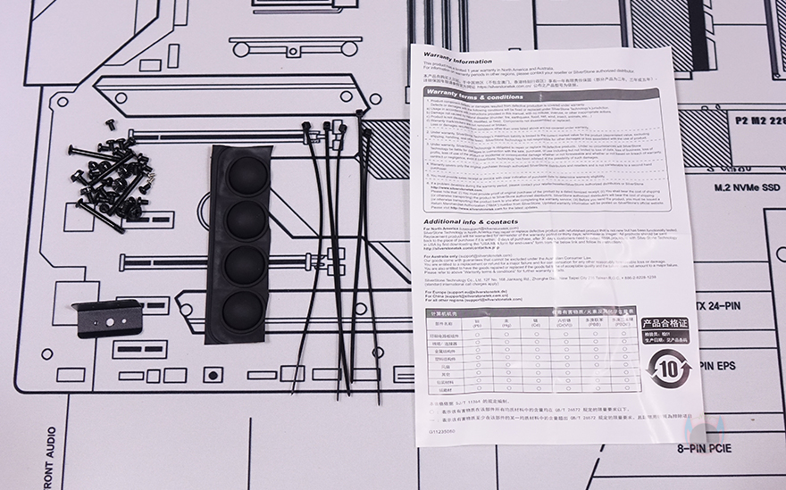 박스를 열어보면, 포장은 기본 비닐 포장에 외부 충격방지를 위해 일단 스티로폼보다 좀 더 충격완화가 좋은 우레탄폼을 사용했으며, 별도의 박스도 함께 확인할 수 있는데, 바로 MILO 12 PC케이스를 수직으로 세워서 이용할 때 사용되는 받침대(Vertical orientation stand)입니다. 그리고, 또하나의 작은 박스에는 PCIe 라이저 카드(Riser Card)가 들어있으며, 이외에도 기본 구성품으로 부품 장착에 필요한 나사들과 브라켓, 수평으로 놓고 이용할 때 사용되는 고무 받침대(Foot pads), 소량의 케이블 타이와 보증서를 제공해주고 있습니다.