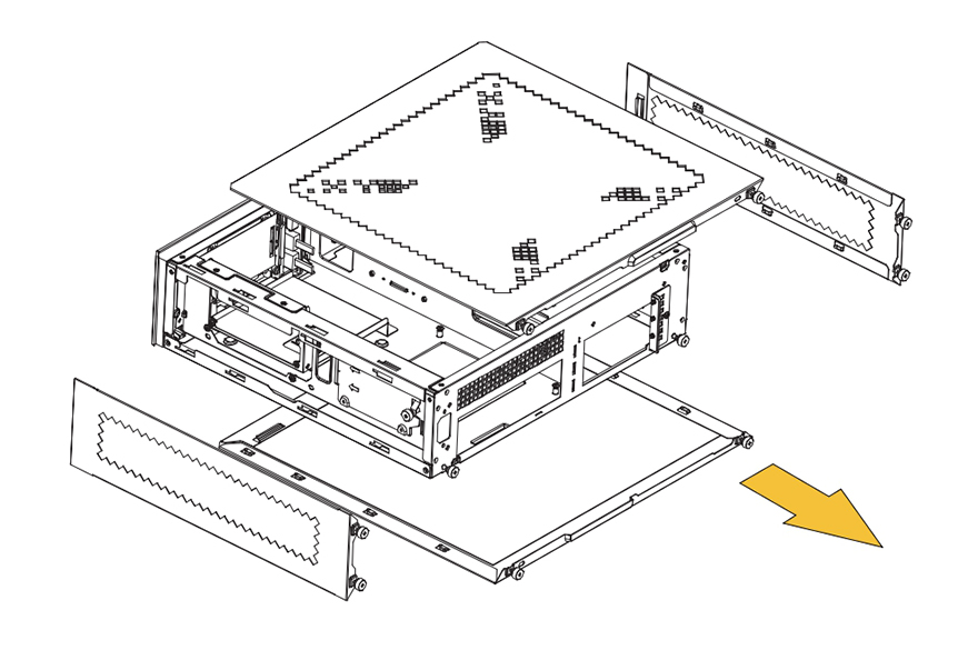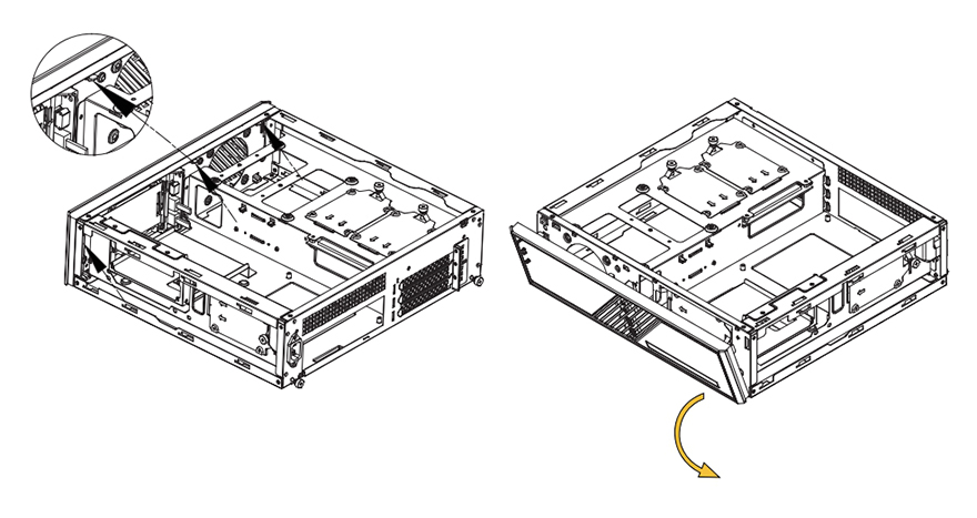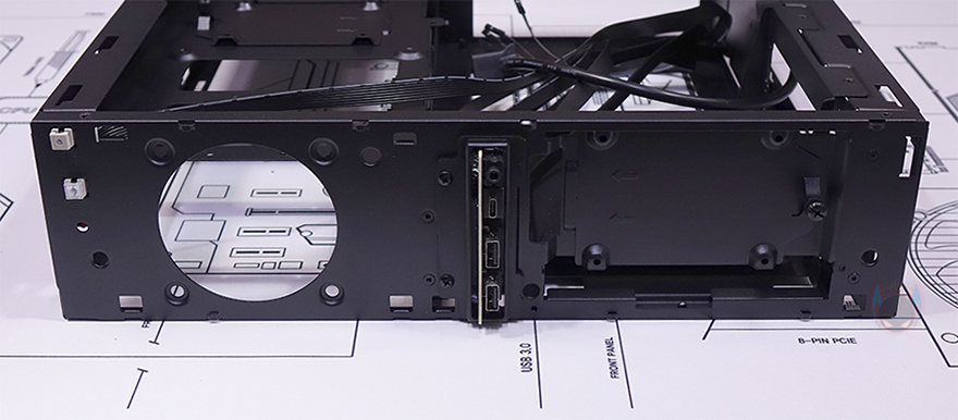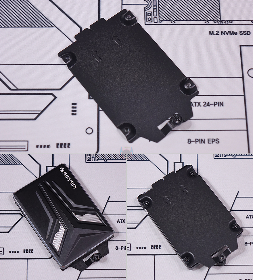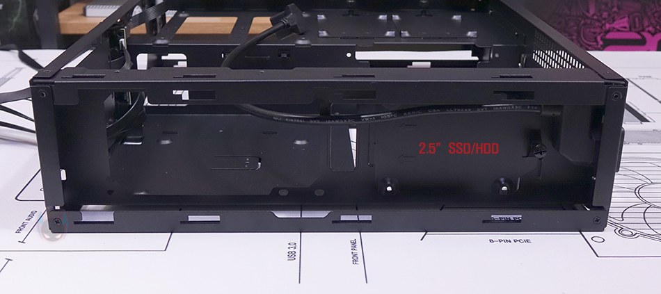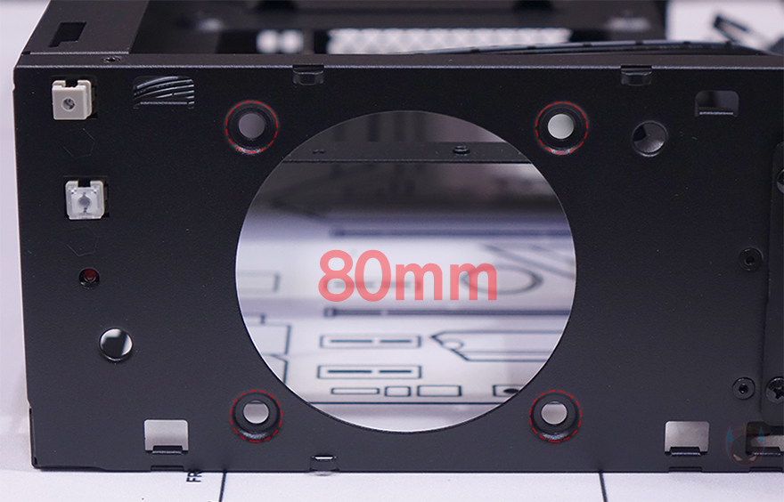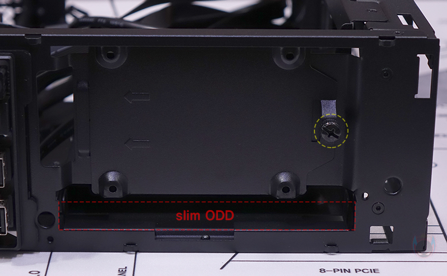 패널과 베젤까지 분리한 상태에서 MILO 12 내부를 살펴보면, 일단 전면 베젤은 분리한 후 전면 내부를 보면 한쪽 그러니깐 그래픽카드가 장착되는 공간 전면 내부에는 80mm 팬을 장착할 수 있게 지원하고 있습니다. 그래서, 앞서 전면 베젤 한쪽에 메쉬(Mesh) 디자인이 왜 적용되었는지를 알 수 있죠. 그리고, 전면 반대쪽 그러니깐 메인보드가 장착되는 공간의 전면 내부에는 2.5인치 SSD/HDD 저장장치(Storage)를 장착할 수 있게 가이드가 장착되어 있으며, 바로 아래에는 앞서 언급한 슬림 ODD를 장착할 수 있는 공간이 마련되어 있습니다. 가이드 장착 역시 손-나사(Hand-screw)가 사용되었기 때문에 쉽게 분리가 가능하고, 분리해서 2.5인치 SSD/HDD를 제공되는 나사를 사용해 장착해 주면 됩니다.