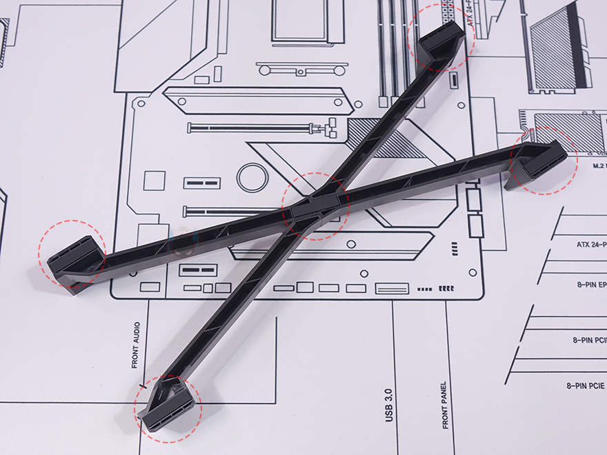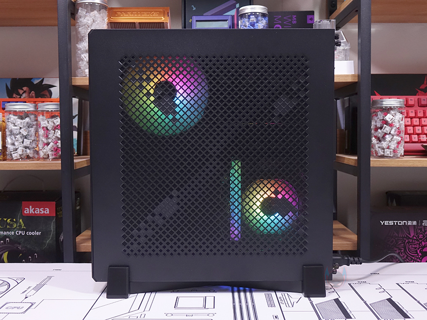 케이블정리까지 마치고 패널까지 닫고 나면 MILO 12를 수직으로 세워서 사용할지 수평으로 눕혀서 사용할지 사용자가 선택을 할 수 있는데, 수직으로 세워서 사용할때는 제공되는 받침대를 홈에 맞춰서 X자로 조립해 사용하면 됩니다. 받침대에는 진동소음 최소화를 위해 고무 패드가 곳곳에 부착되어 있으며, 바닥 부분에도 부착되어 있죠. 그리고, 반대로 수평으로 사용할 때는 역시 제공되는 반구형태의 고무 받침대를 부착해서 사용하면 됩니다. 개인적으로 반구형 고무패드가 접착테이프 방식이라 케이스에 흠집이 싫다면 수직으로 세워서 사용하길 추천하며, 모든 패널에 에어홀 처리가 되어 있기 때문에 CPU 쿨러나 그래픽카드 또는 앞서 확인한 140mm 팬을 RGB 팬으로 장착한다면, 외부에서도 에어홀을 통해 간접적으로 RGB 효과를 볼 수 있습니다.