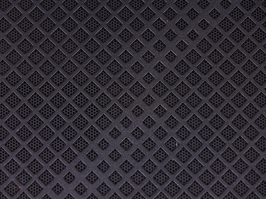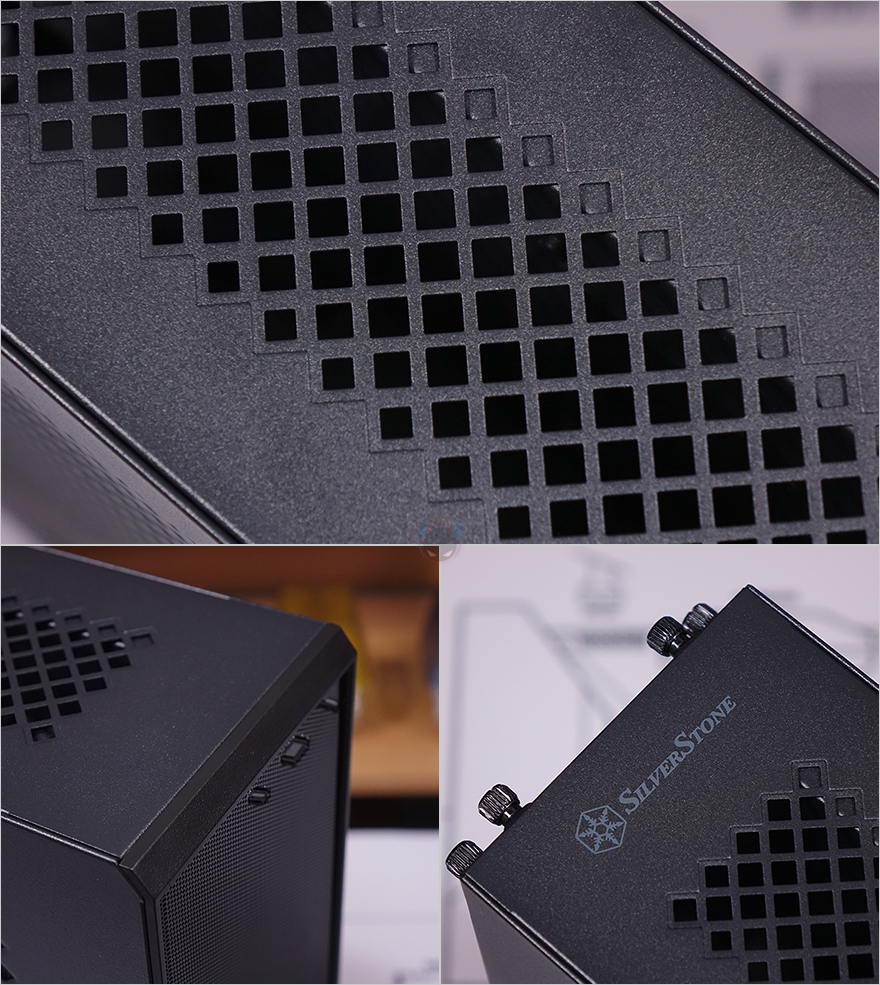 MILO 12 PC케이스는 수평/수직 어느 방향이든 놓고 사용할 수 있기때문에, 양쪽 사이드 패널(Side panel) 디자인을 동일하게 마름모 디자인의 에어홀 처리를 적용하고 있습니다. 물론, 안쪽에는 먼지필터(Dust filter)도 기본 적용된 것을 간접적으로 확인할 수 있죠. 그리고, 양쪽 측면 역시 마름모 디자인의 에어홀 처리를 해놨습니다. 또한, 전면과 구분되는 앞쪽 경계 부분은 직각이 아닌 커팅형태의 디자인으로 처리했으며, 뒤쪽에는 Silverstone 로고를 새겨놨죠.