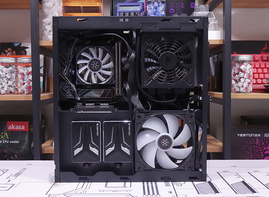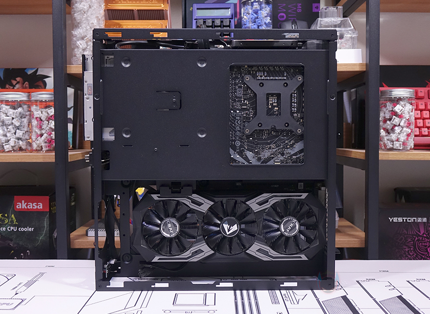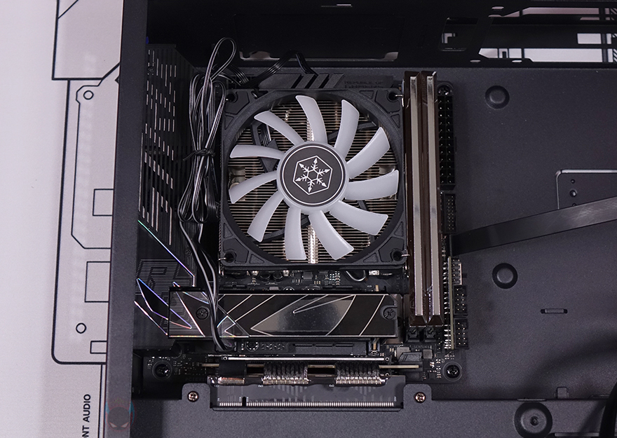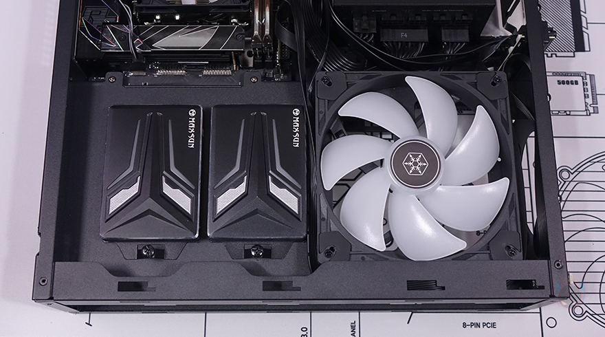 직접, 실버스톤(Silverstone) MILO 12 ITX PC케이스를 사용해 시스템 조립을 해보면, 일단 메인보드와 그래픽카드 공간이 서로 반대편으로 나뉘어져 있기 때문에 조립 순서는 크게 상관없습니다. 일단, 메인보드 같은 경우에는 당연히 Mini-ITX 규격만 장착이 가능하고, CPU 쿨러 같은 경우 로우-프로파일 쿨러형태로 최대 77mm 높이까지 지원하며, 제공되는 PCIe 라이저 카드(Riser Card)를 통해 그래픽카드와 연결되기 때문에 빳빳한 PCIe 라이저 카드를 먼저 메인보드 PCIe 슬롯에 장착하고 메인보드를 장착하는 게 수월합니다. 그리고, 요즘은 거의 사용하지 않지만 만약 슬림(Slim) ODD를 장착해서 사용한다면, 두께 9.5mm(ODD 전면 기준) 이하 제품만 사용해야 하고, 장착을 할 때는 먼저 제공되는 브라켓을 ODD 후면에 장착하고 파워서플라이 자리 하단에 먼저 장착해 주면 됩니다. 파워서플라이는 앞서 확인했듯이 가이드에 장착한 후 역순으로 다시 케이스 내부에 가이드를 장착하면 됩니다. 그리고, 같은 공간 아래에는 2.5인치 SSD/HDD 저장장치 2개를 장착할 수 있고, 그 옆에는 140mm 팬을 장착해서 그래픽카드 후면 쿨링 시스템을 갖출 수 있습니다.