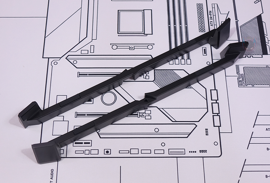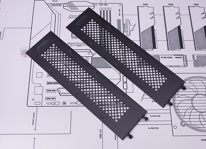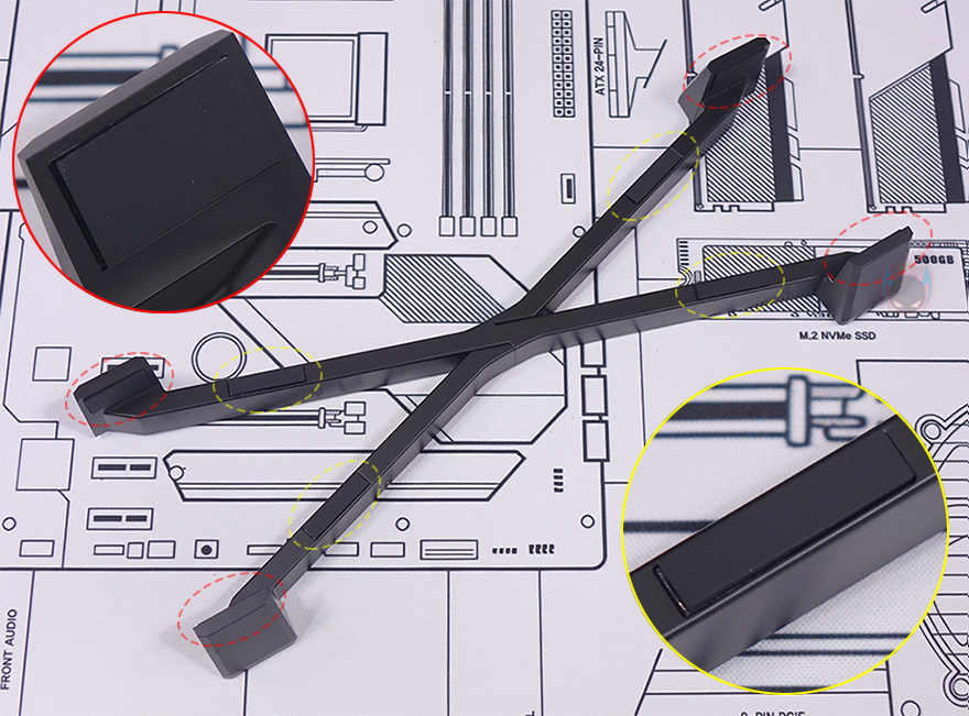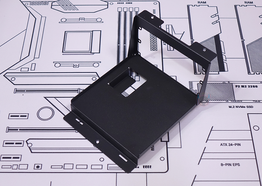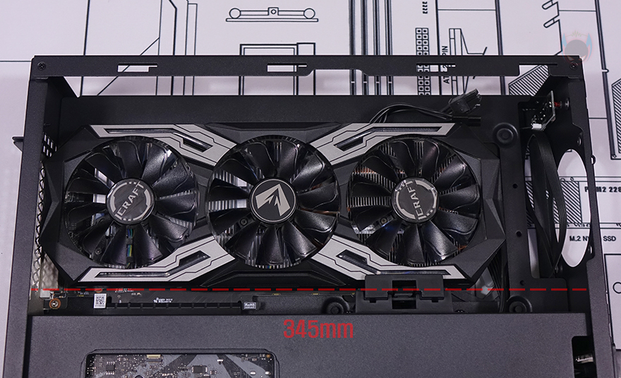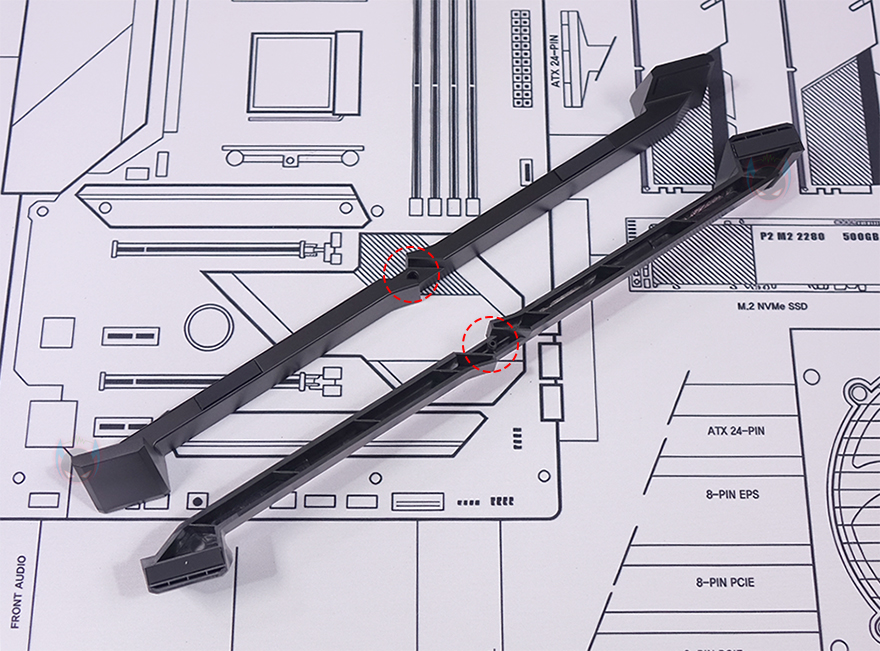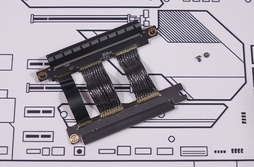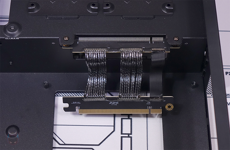 그리고, 반대편 공간인 그래픽카드(VGA)가 장착되는 공간은 최대 355mm 길이에 160mm 폭을 지원하는데, 한쪽에는 길이 조절이 가능한 지지대(Graphics card stand)도 적용되어 있습니다. 그리고, 메인보드와 연결되는 부분에는 홀-처리와 함께 앞서 구성품에서 확인한 PCIe 라이저 카드(Riser Card)를 장착해서 사용하면 되죠.