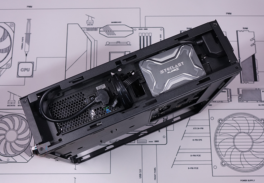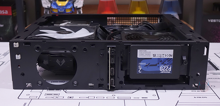 반대편에 장착되는 그래픽카드(VGA)는 최대 345mm 길이까지 지원하고, 앞서 확인했듯이 PCI 슬롯이 3개라 3단 높이(62mm)까지 가능하기때문에 현재 최신 모델의 최상급 제품을 제외하고 대부분의 그래픽카드는 장착이 가능합니다. 또한, 지지대도 있고, 전면에 추가로 80mm 팬도 장착할 수 있어서 PC케이스가 슬림하다고 해서 고정과 쿨링에 대한 걱정은 크게 하지 않아도 됩니다. 그리고, 파워서플라이 측면에는 앞서 확인했듯이 추가로 2.5인치 SSD/HDD를 1개 더 장착할 수 있고, 전면에도 역시 2.5인치 SSD/HDD를 1개 더 장착할 수 있습니다.