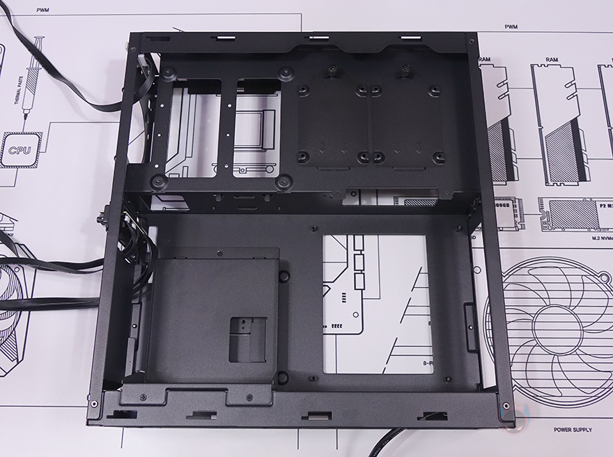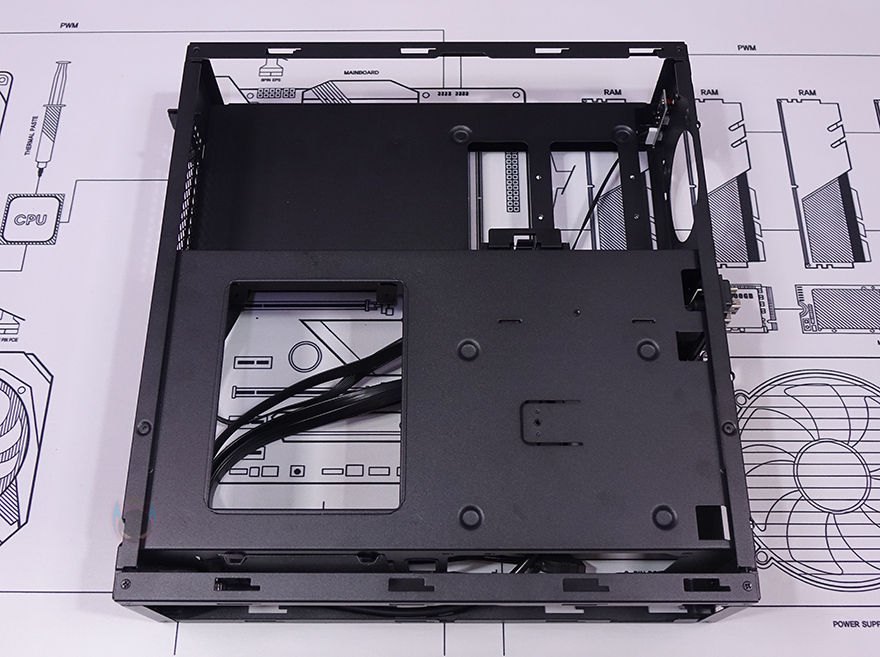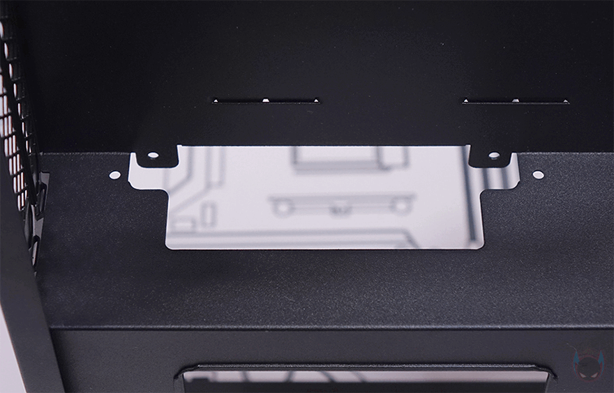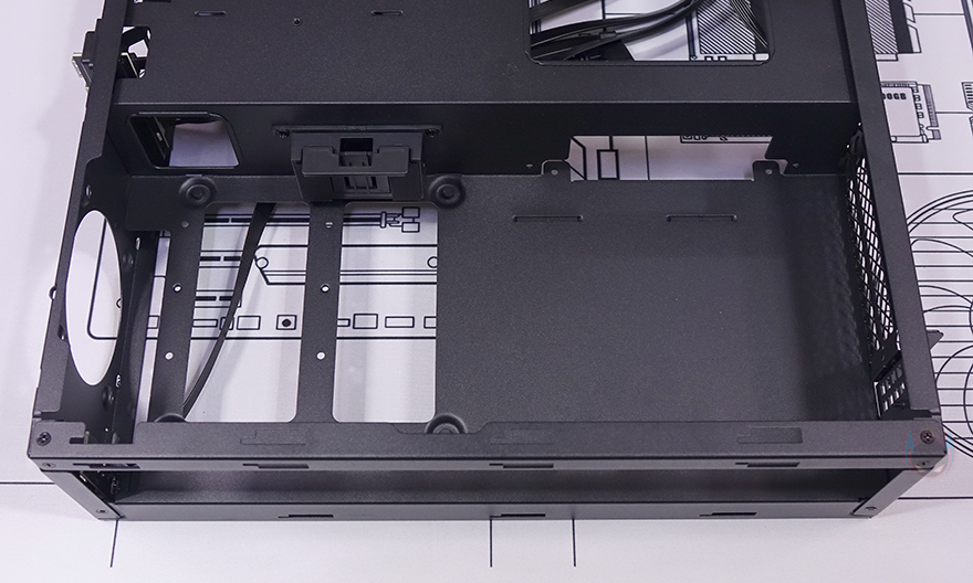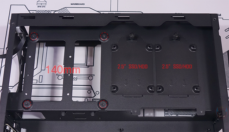 또한, 그래픽카드가 장착되는 공간 후면에는 추가 쿨링시스템을 갖출 수 있게 140mm 팬을 장착할 수 있는 나사홀이 처리되어 있으며, 그 옆으로 2.5인치 SSD/HDD를 2개 장착할 수 있는 가이드가 장착되어 있습니다. 그러니깐 전면 80mm 팬에 이어서 바로 내부 뒷쪽에 140mm 팬까지 적용해 그래픽카드 쿨링효과를 높일 수 있도록 한 거죠. 그리고, 바로 공간에는 메인보드가 장착되는 공간으로 앞쪽에는 파워서플라이(PSU)가 장착되는데, 역시 가이드에 장착하는 방식으로 나사를 풀면 파워서플라이 가이드를 쉽게 분리할 수 있습니다. 파워서플라이 가이드에는 최대 160mm 폭까지 장착할 수 있게 지원하고 있어서 SFX 규격은 물론, SFX-L 또는 깊이(Depth)가 작은 ATX 규격도 장착이 가능합니다. 그리고, 그대로 아래쪽 공간 그러니깐 측면 내부 공간에는 파워서플라이와 연결되는 연장 케이블과 함께 추가로 2.5인치 SSD/HDD를 장착할 수 있는 가이드를 또 확인할 수 있어서, MILO 12에 총 장착되는 2.5인치 SSD/HDD는 4개까지 가능하다는 걸 알 수 있죠.