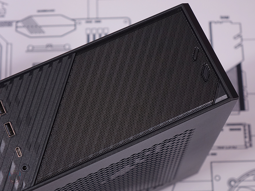 그럼, 본격적으로 실버스톤(Silverstone)의 MILO 12 ITX PC케이스를 살펴보는데, 일단 색상은 블랙색상 1가지로 출시되었으며, 크기는 앞서 사양표기에서 확인했듯이 105(W)x393(H)x378(D)mm를 가졌습니다. 한눈에 봐도 슬림하기 때문에 ITX기반 PC케이스라는 걸 알 수 있고, MILO 시리즈(Series) 특유의 심플한 디자인도 나름 유지하고 있습니다. 전면 베젤을 살펴보면, 실버스톤은 슬림형 ITX PC케이스에 슬림(Slim) ODD 지원을 항상 갖추고 나오는데, 이번 MILO 12 모델 역시 전면 한쪽에 금속느낌의 헤어라인 디자인과 함께 슬림 ODD 커버가 적용된 것을 확인할 수 있습니다. 그리고, 중앙에는 사선 디자인과 함께 USB 3.0 Type-A 포트 2개와 Type-C 포트 1개, EAR/MIC 포트가 배치되어 있으며, 나머지 전면 한쪽에는 메시(Mesh) 디자인과 함께 끝부분에 전원 버튼(Power button)과 리셋 버튼(Reset button), 그리고 작동상태를 확인할 수 있는 LED 램프가 배치되어 있죠. 전면 베젤에서만 3가지 디자인이 적용되었다라는 걸 알 수 있습니다.