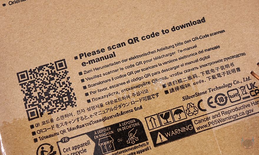 제품 박스부터 살펴보면, ITX PC케이스이기때문에 박스는 작고 슬림한 편으로 전후면에는 동일하게 제품이 세워진 형태의 이미지를 담고 있으며, 모델명도 확인할 수 있는데, 바로 아래에 콘셉트 문구에도 슬림(Slim)과 미니-ITX(Mini-ITX)를 표기해 놨죠. 박스 한쪽 측면에는 제품의 기본 사양을 표기해 놨는데, 크기와 장착 가능한 저장장치 개수, PCI 슬롯 개수를 확인할 수 있습니다. 그리고, 반대쪽 측면에는 한국어를 포함해 간략하게 제품의 주요 특징을 표기해 놨죠. 또한, 최근 실버스톤은 친환경 정책으로 제품설명서를 제공하지 않고, QR코드를 통해 홈페이지에서 설명서를 보도록 유도하고 있는데, 이런 내용 역시 제품 박스에서 확인할 수 있습니다.