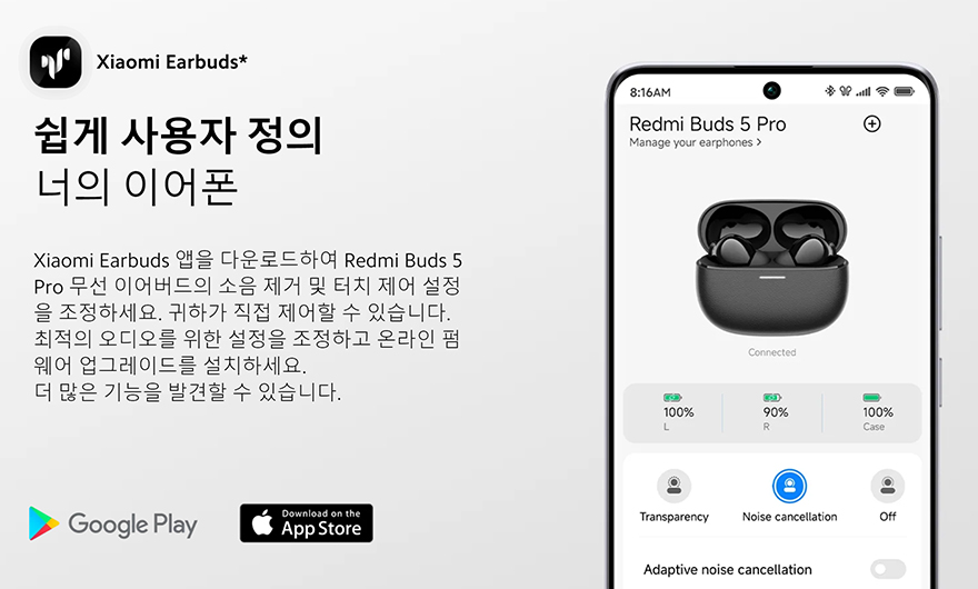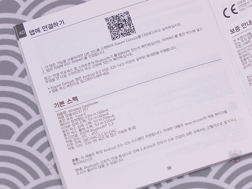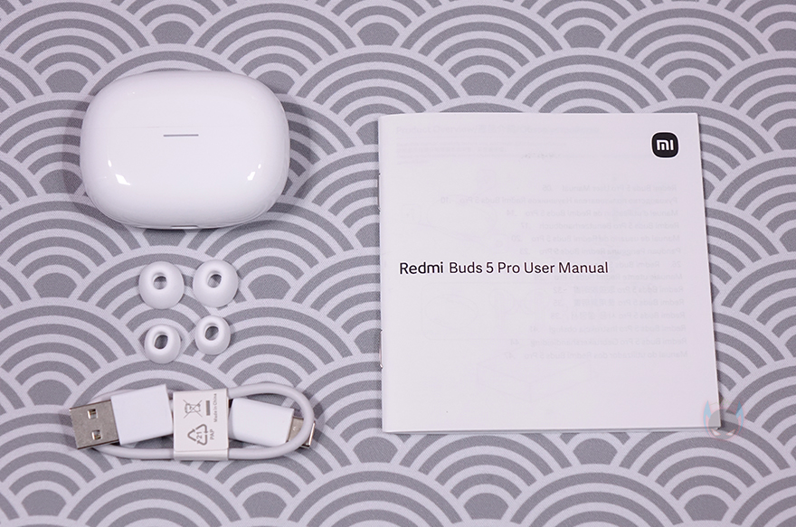 제품 포장은 레드미 버즈 5 프로(Redmi Buds 5 Pro) 무선이어폰과 교체용 이어-팁은 모두 비닐 포장으로 처리되어 있으며, 무선 이어폰 포장에는 전용 어플 지원의 QR코드 표기도 함께 해놔 손쉽게 설치할 수 있도록 유도했습니다. 제품 구성은 레드미 머즈 5 프로 무선이어폰, 교체용 이어-팁(ear-tips), 충전케이블, 제품설명서로 이루어져 있으며, 글로벌 제품이라 설명서에는 한국어도 기본 포함되어 있죠.