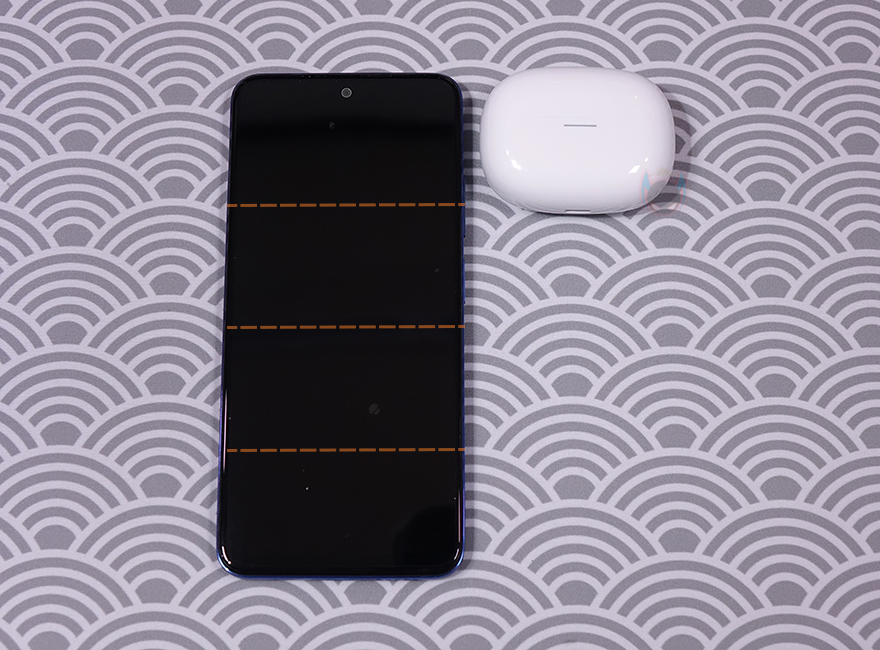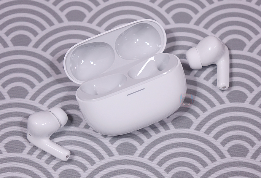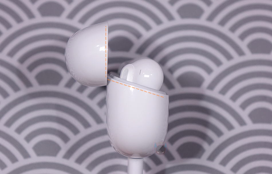 충전케이스를 열어보면, 측면에서 봤을 때 케이스가 수평 형태로 열리는게 아니라 경사진 각도형태로 열리는데 아무래도 타원형 디자인을 가졌기 때문에 좀 더 자연스러움을 주기 위함이라 할 수 있습니다. 그리고, 충전케이스에 수납된 이어폰(Earphone)을 꺼내면 케이스 양쪽 끝부분에 이어폰의 스템(Stem) 부분과 접촉하는 충전-핀을 확인할 수 있죠. 참고로, 충전케이스의 배터리 용량은 480mAh로 앞서 만난 기본 모델 레드미 버즈 5와 동일합니다.