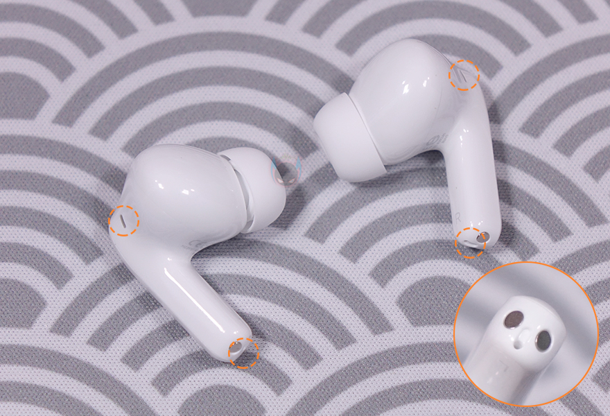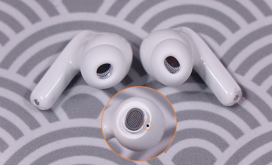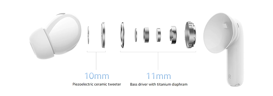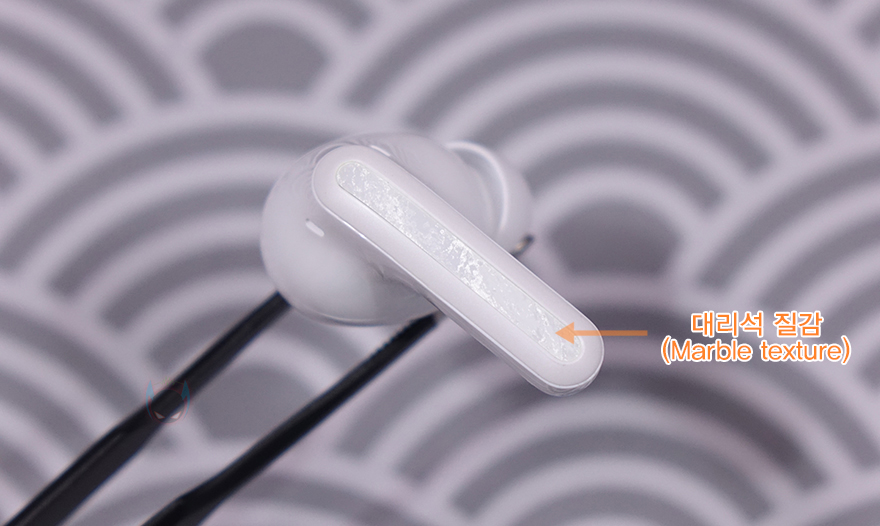 레드미 버즈 5 프로 무선 이어폰의 이어폰(Earphone)을 살펴보면, 커널형의 스템(Stem) 디자인을 가지고 있는데, 스템부분에는 여러 번 코팅 공정을 거쳐 자연 느낌의 대리석 질감(Marble texture) 디자인을 적용해 포인트를 주었습니다. 그리고, 스템 아랫부분 그러니깐 충전-핀과 접촉하는 접지 부근에는 통화 마이크(Talk-mic)가 내부에 위치하고 있으며, 위쪽 바깥쪽 부분과 이어-팁을 제거하면 안쪽에는 노이즈 캔슬링을 위한 피드-포워드(Feed-forward)와 피드백(Feedback) 마이크가 내장되어 있습니다. 그래서, 이어폰당 총 3개의 마이크가 적용되어 있죠. 또한, 내부에는 티타늄 다이어그램의 11mm 베이스 유닛과 10mm 압전 세라믹 트위터 유닛으로 듀얼 드라이버 유닛을 갖추고 있는데, 이 부분이 기본 모델과 가장 큰 차이점이라 할 수 있죠. 그리고, 기본 장착된 이어-팁은 중간(Middle) 사이즈이며, 교체용 이어-팁은 각각 대(Large)/소(Small) 사이즈입니다.