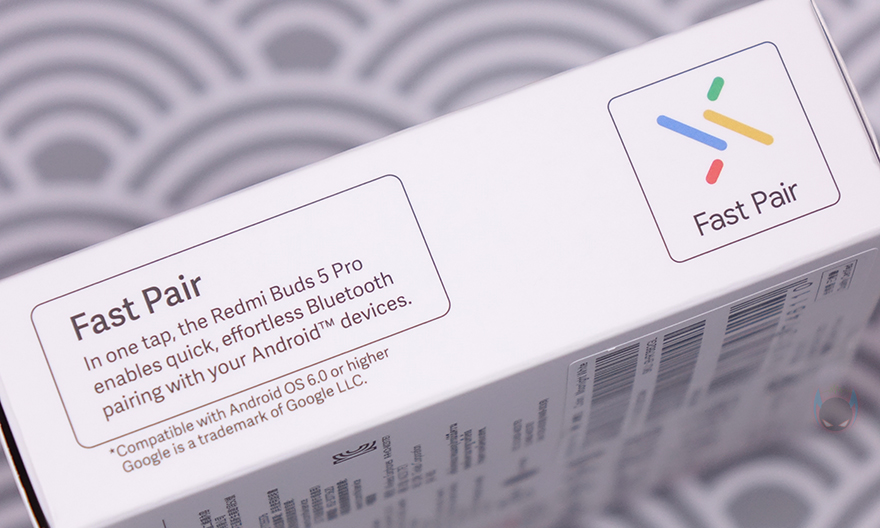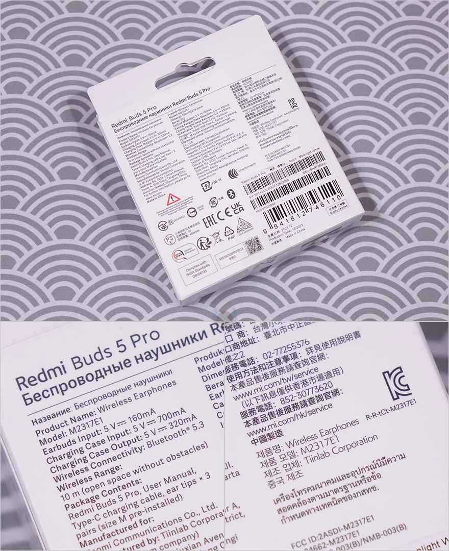제품 패키지는 바로 앞선 시간에 만났던 기본 모델 레드미 버즈 5와 유사합니다. 비슷한 크기의 박스 포장에 전면에 제품 이미지를 담고 있으며, 모델명과 함께 오른쪽에 Hi-Res 오디오 지원표기도 확인할 수 있죠. 박스 측면에는 제품의 주요 특징으로 듀얼 드라이버 유닛, 52dB 액티브 노이즈 캔슬링, 2가지 몰입형 사운드 모드, 3개의 마이크로 인공지능 소음감소, 듀얼 디바이스 지원, 긴 사용시간의 배터리 강조를 표기해 놨습니다. 이외에도 반대쪽 측면에는 앞서 기본 모델에서도 지원확인한 구글계정에 페어링 정보를 저장해 더 빠른 연결(Fast Pair) 지원 표기도 확인할 수 있으며, 박스 후면에는 제품의 기본 사양과 글로벌버전이기 때문에 한국시장의 KC인증 마크도 확인할 수 있습니다.