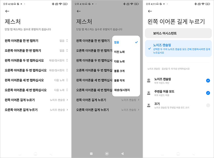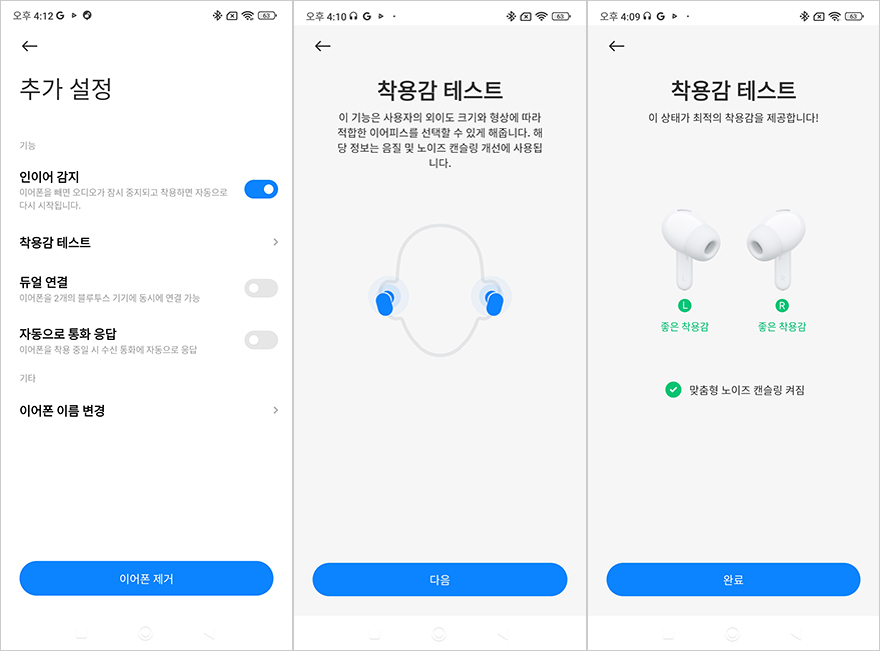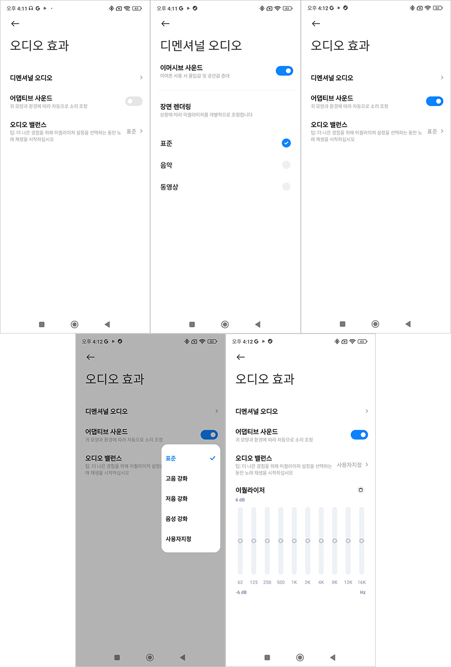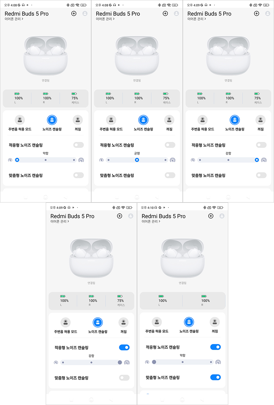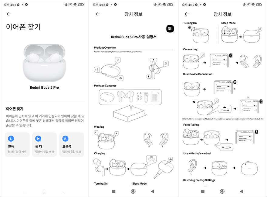 Xiaomi Earbuds 어플로 연결된 레드미 버즈 5 프로 무선이어폰의 기능 지원을 살펴보면, 일단 메인 화면은 앞시간에 먼저 만났던 기본 모델과 마찬가지로 배터리 잔량을 충전케이스, 좌우 이어폰 구분해서 보여줍니다. 그리고, 프로 모델 역시 주변 소음 강도조절을 할 수 있는 모드를 3단계로 조절할 수 있고, 노이즈 캔슬링(Noise canceling) 모드 역시 3단계로 조절이 가능하고, 추가로 프로 모델에선 적응형과 맞춤형 노이즈 캔슬링을 선택할 수도 있습니다. 또한, 제스처 설정을 통해서는 좌우 이어폰의 터치-탭 설정을 할 수 있는데, 1 터치부터 3 터치 그리고 탭 누르기까지 설정할 수 있으며, 탭 누르기는 노이즈 캔슬링과 음성 검색 실행 둘 중 하나를 선택할 수 있습니다. 그리고, 오디오 효과를 통해서는 공간효과 그러니깐 앞서 제품박스에서 언급한 몰입형 오디오 모드의 디멘션널 오디오를 지원하는데 표준/음악/영상 중 선택할 수 있으며, 자동으로 소리조절해 주는 어댑티브 사운드 지원도 해주고 있습니다. 그리고, 오디오 밸런스를 선택하면 기본 모델 레드미 버즈 5처럼 표준/고음/저음/음성 강화 선택을 할 수 있는 건 물론이고, 추가로 사용자 지절의 이퀄라이저 지원도 해주고 있습니다. 이 외에도 공용적으로 지원해 주는 착용감 테스트, 이어폰 찾기 기능이 있으며, 장치정보로 들어가면 제품 사용법도 확인할 수 있죠. 공융 기능을 제외하면 프로 모델답게 기본 모델보다 좀 더 다양한 기능을 지원해주고 있습니다.