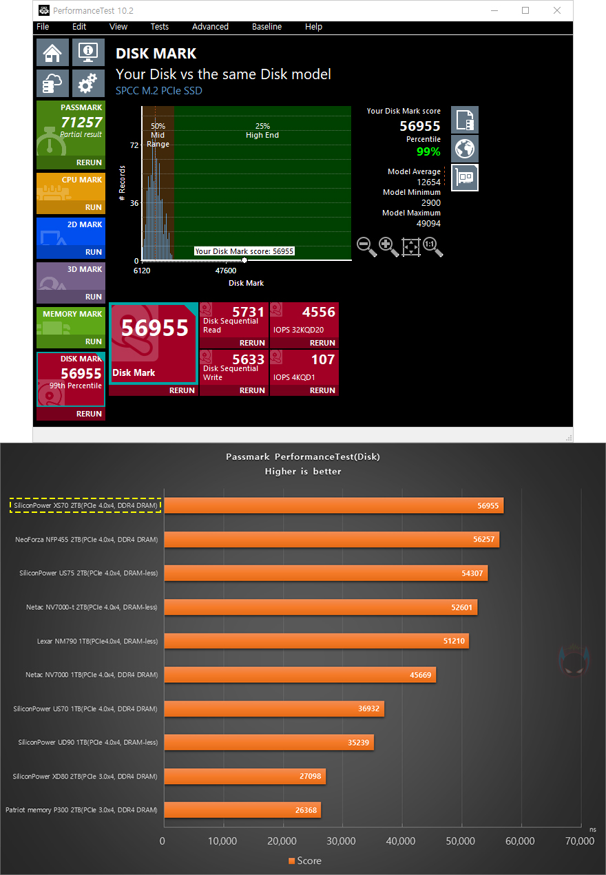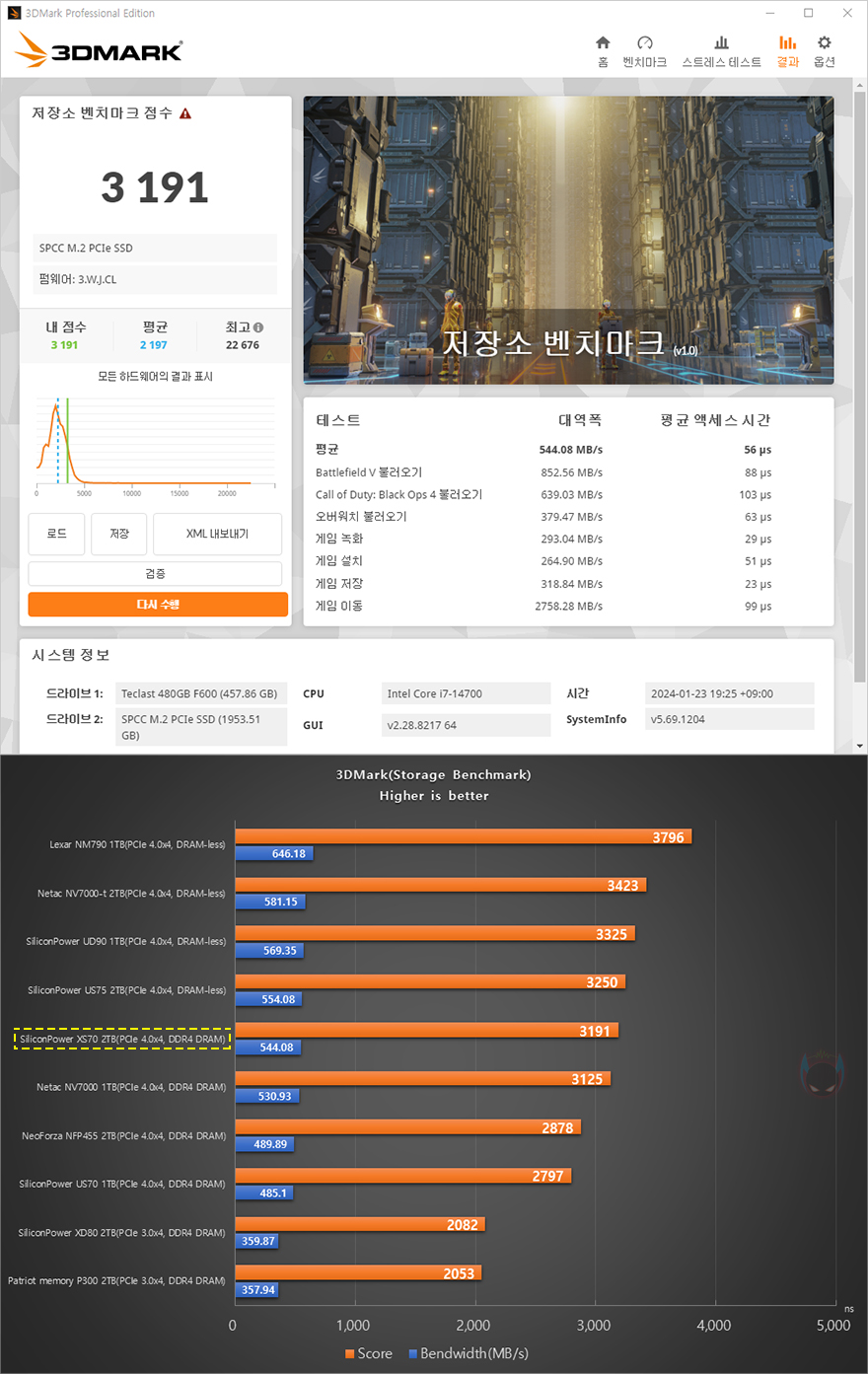 이는 시스템 점수로 보여주는 벤치마크 프로그램 PassMark PerformanceTest DISK 항목에서도 그대로 보여줬는데 전체 비교 SSD 제품 중 가장 높은 점수를 보여줬습니다. 다만, SSD를 게임용으로 사용할 때는 쓰기 속도보다는 읽기 속도를 더 많이 영향 받기때문에, 3DMark 저장소 벤치마크에선 DRAM 여부와 상관없이 동일한 규격상에서 보여주는 3000대 점수를 보여줬습니다. 끝으로, XS70 M.2 NVMe SSD는 실리콘파워의 공용 SSD 툴인 SP ToolBox도 지원하기 때문에 좀 더 XS70를 신경 써서 관리하고 싶다면, 툴을 설치해서 한 번씩 SSD 상태를 체크해 주면 유지보수에 좋습니다.