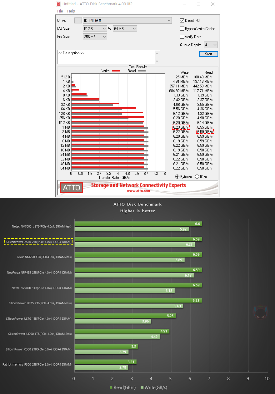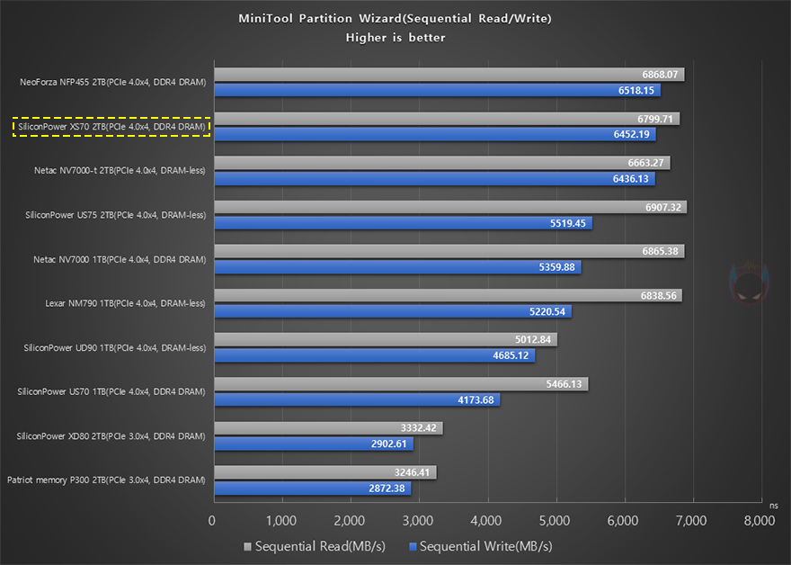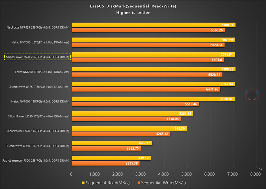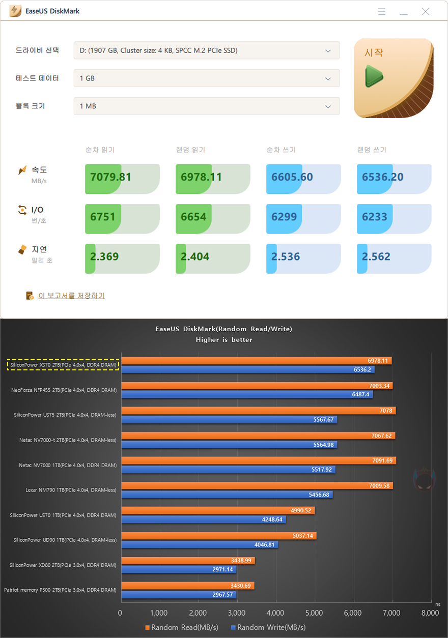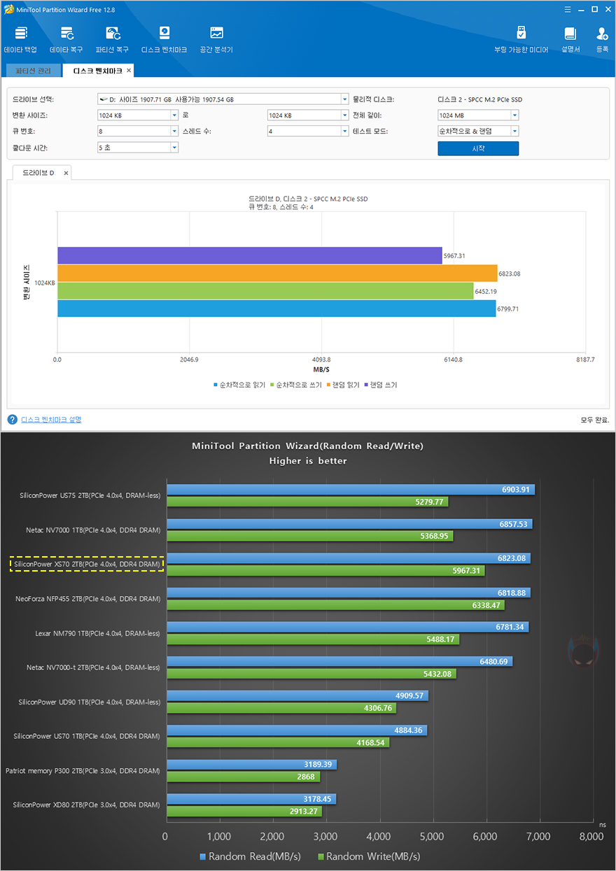 좀 더 다양한 벤치마크 프로그램을 통해 XS70 M.2 NVMe SSD 성능을 확인해 보면, ATTO Disk Benchmark를 통해서도 XS70 M.2 NVMe SSD가 가진 DRAM 장점을 그대로 보여줍니다. 전체 비교 SSD 제품들 중 동일한 규격의 SSD 제품들과 비교해 보면, 읽기 속도는 모두 비슷한 결과를 보여주지만, 쓰기 속도에서 확실히 DRAM의 이점으로 가장 높은 속도를 보여주고 있죠. 이는 또 다른 벤치마크 프로그램 EaseUS DiskMark, MiniTool Partition Wizard Free 디스크 벤치마크에서도 비슷한 결과를 보여줬습니다. XS70 M.2 NVMe SSD와 동일한 PCIe 4.0x4 규격의 SSD들은 DRAM 여부 상관없이 읽기 속도가 비슷하지만, 확실히 쓰기 속도에선 DRAM을 가진 XS70 M.2 NVMe SSD가 더 빠른 속도를 자랑하고 있죠.
