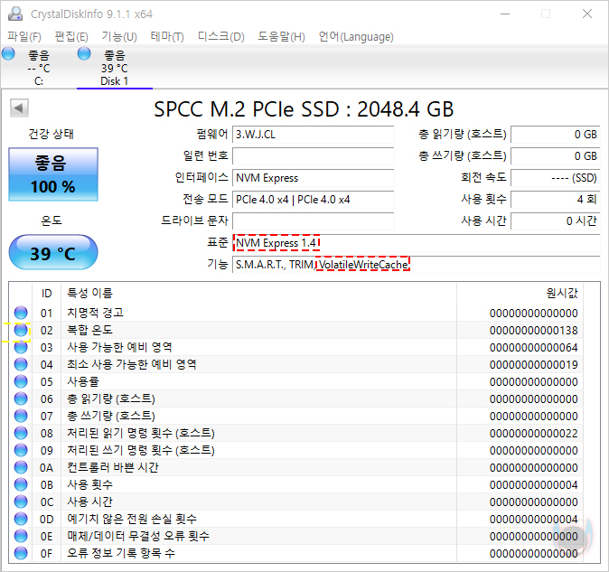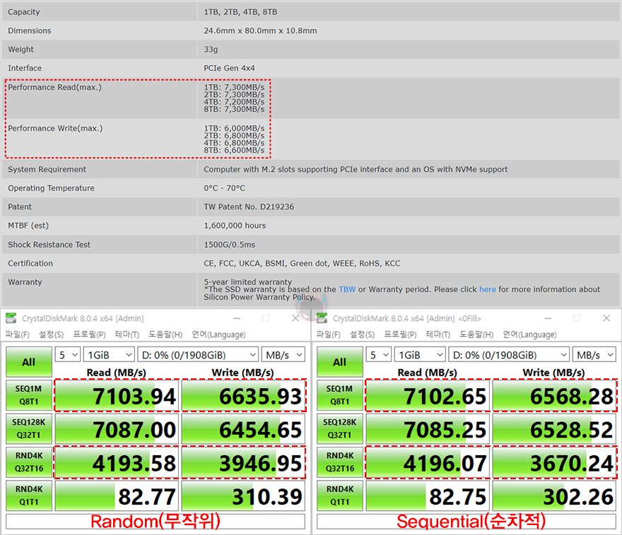 그럼, 이제 실리콘파워(SiliconPower) XS70 M.2 NVMe SSD의 성능을 확인해 볼 텐데, 그전에 간단하게 CrystalDiskInfo를 통해 장착된 XS70 M.2 NVMe SSD의 정보를 확인해 보면, PCIe 4.0x4 규격과 NVMe 1.4 버전, 그리고 속도저하를 방지하는 VolatileWriteCache 기술 등이 적용된 것을 확인할 수 있습니다. 참고로, 앞서 언급했듯이 XS70에는 DRAM이 적용되었기 때문에, DRAM이 적용되지 않은 디램리스(DRAM-less) 제품보다 속도유지에서 장점을 가지고 있습니다. 그래서, XS70 M.2 NVMe SSD 같은 경우에는 2TB 용량부터 읽기(Read)와 쓰기(Write) 속도가 PCIe 4.0x4 규격상 최대 속도를 보여주는데, 디램리스 같은 경우에는 이런 속도를 스펙상으로 가지고 있어서도 쓰기 속도가 6000MB/s 아래로 나오는 경우가 많죠. 하지만, 스펙상으로 많이 측정하는 CrystalDiskMark를 통해 XS70 M.2 NVMe SSD 속도를 측정해 보면 오차범위 내에서 읽기와 쓰기 속도가 유지되는 것을 확인할 수 있습니다. 또한, 실사용 속도로 보는 RND4KQ32에서도 디램리스보다 높은 읽기 속도로 나오는 걸 확인할 수 있죠.