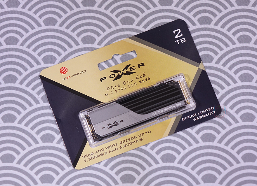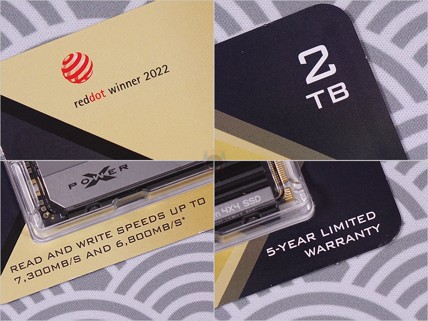 제품 패키지는 기존 실리콘파워(SiliconPower) 제품들과 마찬가지로 액세서리 제품처럼 투명-캡 방식으로 포장되어 있어서 소비자가 외부에서 바로 포장된 제품 실물을 확인할 수 있습니다. 시작에서 언급했듯이 XS 시리즈에만 적용되는 방열판도 바로 확인이 되죠. 그리고, 패키지에는 XPOWER 표기를 확인할 수 있는데, 사실 XS 시리즈면 사실상 실리콘파워에서 최상위 라인업이라 실리콘파워의 게이밍 라인업인 XPOWER에 속하는 제품일수밖에 없죠. 모델명을 비롯해, PCIe 4.0x4 규격과 2022년도 레드닷(reddot) 수상, 용량, 읽기와 쓰기 속도, 5년의 보증기간 지원 표기를 확인할 수 있습니다. 일단, 표기된 읽기와 쓰기 속도로 봤을 때는 DRAM이 적용된 모델로 추측해 볼 수 있죠.