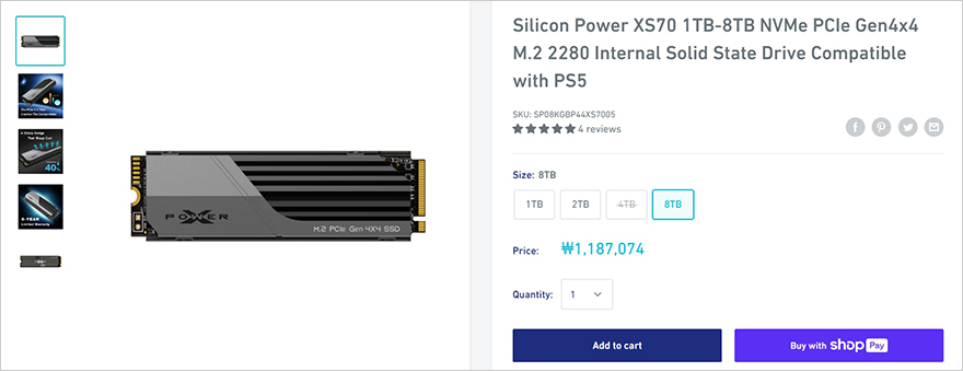 측면에 방열판을 고정하고 있는 나사를 풀면, 방열판 분리가 일반적으로 가능한데, 리뷰에 사용된 제품경우 상당히 단단하게 붙어있어서 위험성을 감안해 분리하지 않았습니다. 다만, 해외 리뷰 기사를 참고하자면, XS70 2TB 모델의 경우 컨트롤러 칩셋은 파이슨(PHISON)의 PS5018-E18 칩셋으로 이는 PCIe 4.0x4 규격에 최대 8TB 용량까지 지원하고, DDR4 DRAM을 지원합니다. 그래서, XS70에도 SK하이닉스의 DDR4-2666 DRAM이 사용되었으며, 국내에는 4TB 용량까지만 판매되지만, 실리콘파워의 글로벌 공식스토어에선 최대 8TB 용량까지 판매되고 있습니다.