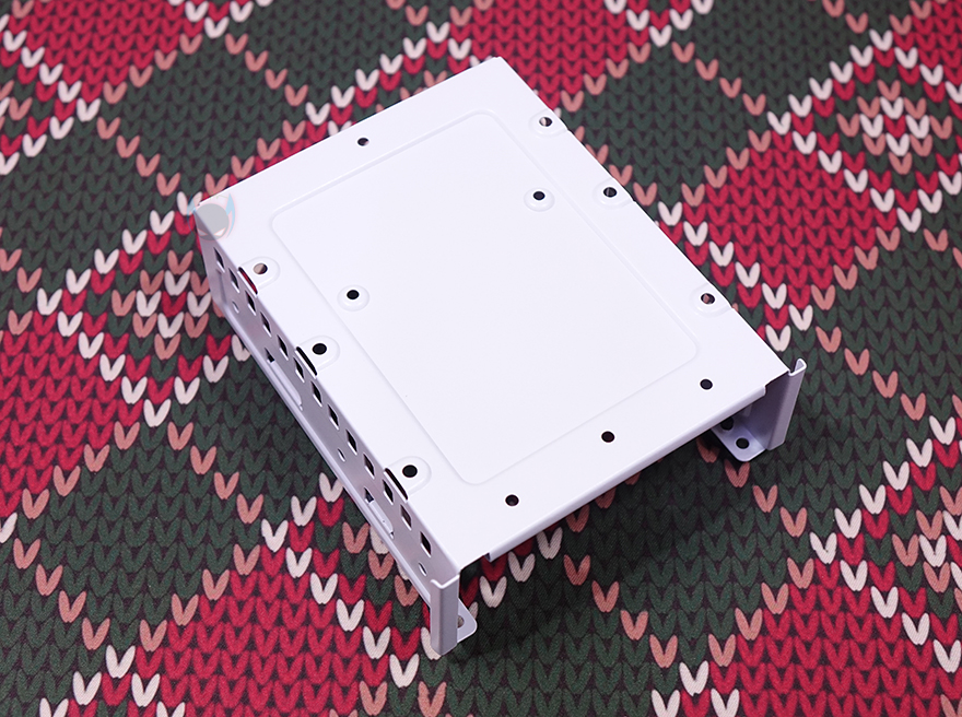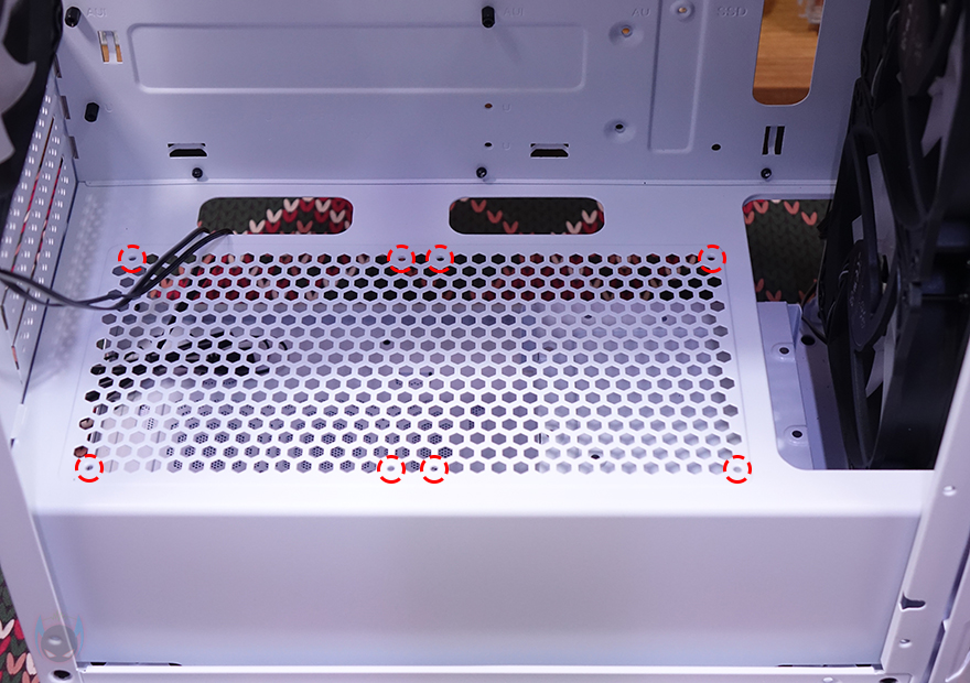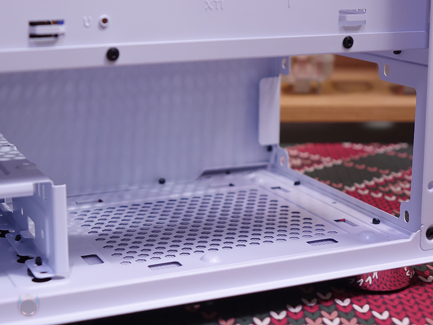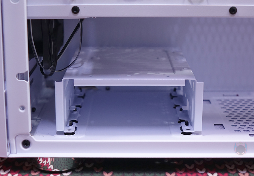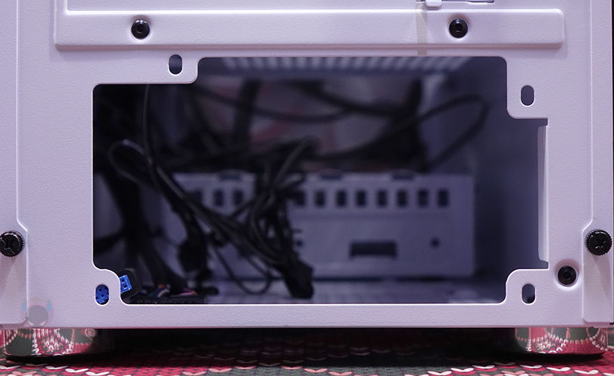 메인보드 트레이 후면쪽에는 하단에 파워서플라이와 저장장치가 장착되는 공간을 확인할 수 있는데, 파워서플라이 공간에는 샤시 자체로 받침대 모양을 적용했으며, 별도의 패드는 부착되어 있지 않습니다. 그리고, 하단 공간 앞자리에는 HDD를 장착할 수 있는 HDD 베이(Bay)가 장착되어 있는데, 앞서 외부에서 언급했듯이 외부 하단에서 고정된 나사 2개를 풀면 쉽게 분리가 됩니다. HDD 베이에는 안쪽에 기본 3.5인치 HDD 1개를 장착할 수 있고, 베이 상단에는 3.5인치 HDD나 2.5인치 HDD/SSD를 추가로 장착할 수 있습니다. 그리고, 만약 케이블 정리 공간이 부족하다면, HDD 베이를 장착하지 않거나 HDD 베이에 장착된 고정 나사를 풀어서 3.5인치 HDD에 장착하면 베이를 사용하지 않고도 내부 하단에 HDD를 장착할 수 있죠.