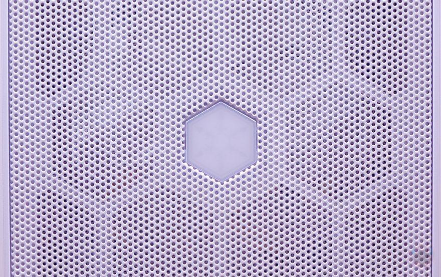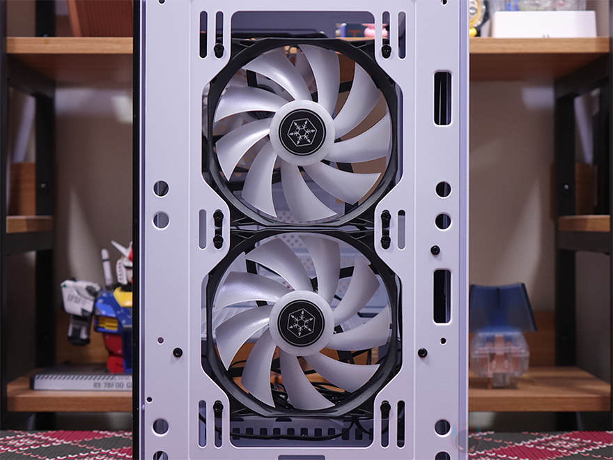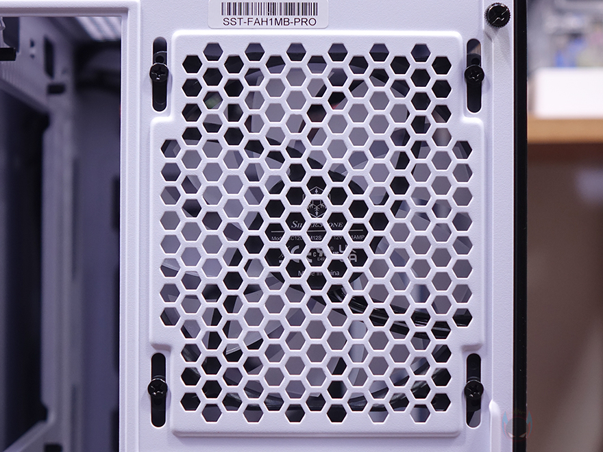 케이스 전면에는 풀-메쉬(Full-Mesh) 디자인과 함께 내부에 큼지막한 벌집망 구조를 간접적으로 확인할 수 있으며, 아래에는 Silverstone 로고(Logo)를 적용해 놨습니다. 또한, 베젤 측면에도 외부 공기가 유입되도록 에어홀 디자인을 처리해 놨죠. 전면 베젤에 버튼이나 포트가 배치되어 있지 않기 때문에, 바로 분리가 가능한데, 베젤을 분리하면, 전면 내부에 화이트색상에 맞춘 자석방식의 먼지 필터(Magnetic dust filter)를 확인할 수 있습니다. 그리고, 필터를 분리하면 전면 내부에 120mm 팬이 기본 2개 장착한 것도 확인할 수 있는데, 모두 ARGB 팬이죠. 물론, 140mm 팬으로 교체 장착도 가능하고, 수랭쿨러시 라디에이터(Radiator) 장착도 최대 240mm까지 장착할 수 있습니다.