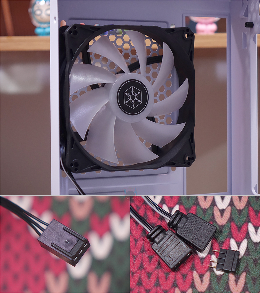 내부 후면에는 외부 후면에서 간접적으로 먼저 확인했던 120mm 팬을 다시 확인할 수 있는데, 전면에 기본 장착된 팬과 동일한 팬으로 총 9개의 날개(Blade)를 가졌고, 팬 연결방식은 3핀(Pin)에 ARGB 지원으로 5V 커넥터를 갖추고 있습니다. 물론, 팬끼리도 서로 연결할 수 있게 연장케이블이 함께 적용되어 있죠. 그리고, 아래에 PCI 슬롯가이드는 일회용으로 적용되어 있습니다.