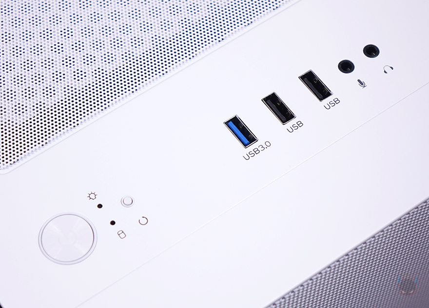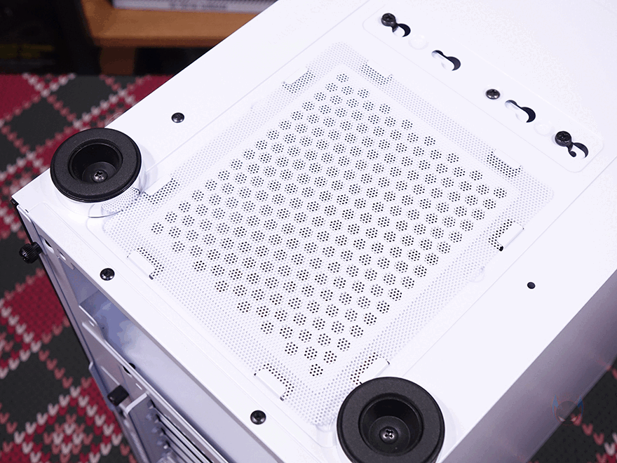 FARA H1M 케이스에는 맨 앞부분에 버튼 및 포트들이 배치되어 있는데, 맨 왼쪽에는 전원버튼(Power button)과 리셋(Reset) 버튼 그리고 작동상태를 알 수 있는 LED 램프가 배치되었으며, 오른쪽으로는 USB 3.0 포트 1개, USB 2.0 포트 2개, 마이크(MIC), 헤드폰(EAR) 포트가 배치되어 있습니다. 그리고, 뒤로는 상단 쿨링 효과 및 쿨링 시스템을 갖출 수 있게 자석방식의 먼지 필터와 함께 에어홀 처리를 해놨는데, 전면과 마찬가지로 팬을 120/140mm 최대 2개까지 장착할 수 있죠.
