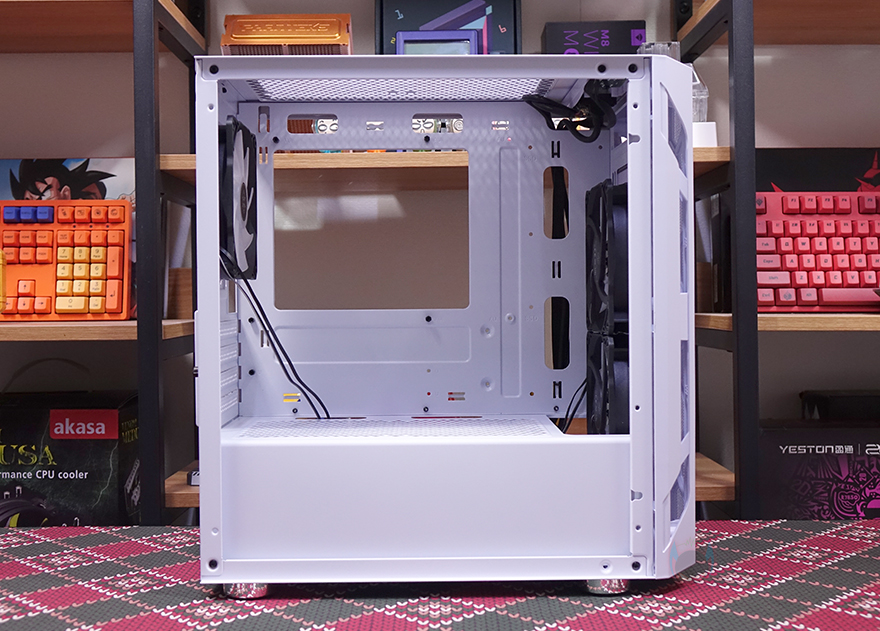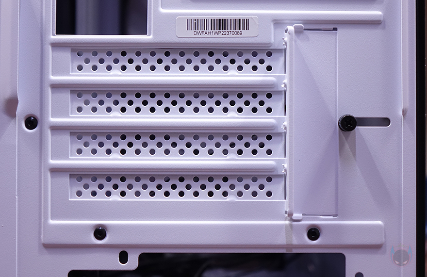 사이드 패널은 앞서 언급했듯이 FARA H1M 모델 중 화이트 색상은 왼쪽 패널을 강화유리(Tempered glass)로 적용했으며, 후면 위아래에 각각 손나사로 고정되어 나사를 풀면 일반 패널처럼 후면으로 당겨서 분리하는 방식입니다. 반대편인 오른쪽 패널은 일반 샤시 패널의 민무늬로 처리되어 있죠. 그리고, 케이스 후면에는 배기역할로 에어홀 처리와 함께 내부에 120mm 팬이 기본 장착된 것을 간접적으로 먼저 확인할 수 있으며, 아래에 PCI 슬롯은 미니타워 기준인 4개의 슬롯 자리를 갖추고 있습니다. 맨 아래에는 파워서플라이 자리로 상하방향으로 모두 장착할 수 있게 나사홀이 처리되어 있죠.