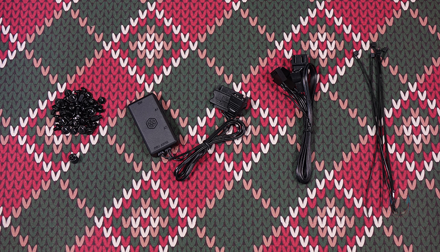 제품 포장은 PC케이스의 기본 포장인 외부 충격방지를 위한 스티로폼 완충재와 비닐 포장으로 처리되어 있으며, 부속품 지원에는 부품 장착에 필요한 각종 나사들, ARGB 허브(HUB), 팬 커넥터 연장 케이블, 소량의 케이블 타이를 제공해주고 있습니다.