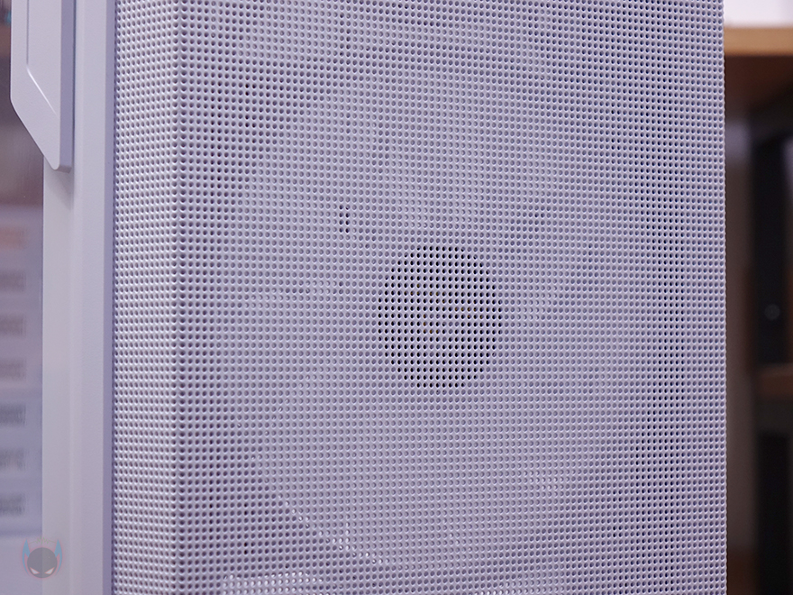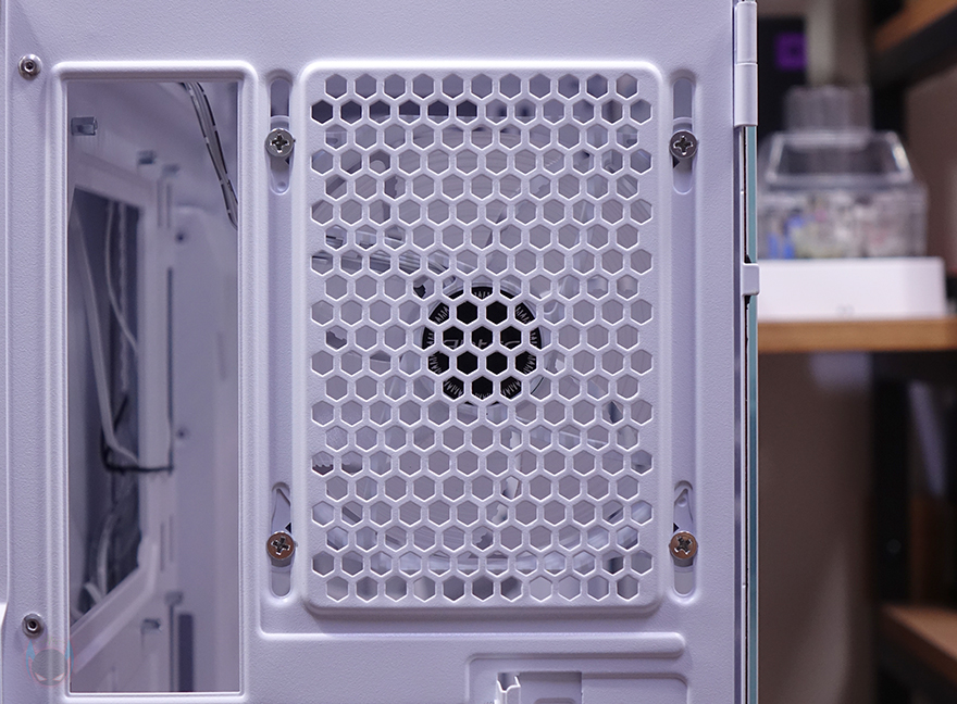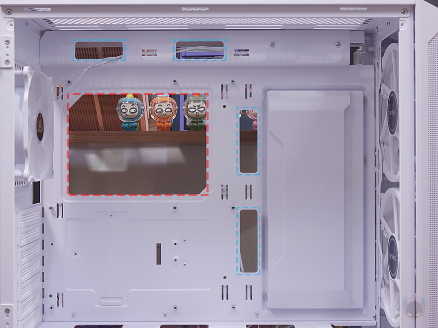 이제, 안텍(Antec) NX416L PC케이스의 내부를 살펴보는데, 화이트 색상경우 내부도 화이트 색상으로 도색처리되어 있으며, 메인보드가 장착되는 트레이(Tray) 부분에는 CPU-cut-Out을 비롯해 주변으로 케이블 정리를 할 수 있게 선정리-홀이 처리되어 있습니다. 그리고, 앞부분 측면 그러니깐 외부에서 봤을 때 오른쪽 패널의 측면 에어홀 위치에 내부에는 커버가 적용되어 있는데, 후면에서 나사를 풀면 쉽게 분리가 되고, 커버는 안쪽에는 2.5인치 HDD/SSD 2개를 장착할 수 있는 공간이 있습니다. 쉽게 말해, 저장장치 겸 후면 케이블이 보이지 않게 커버 역할을 동시에 하는 거죠. 물론, 커버를 사용하지 않으면 측면에 추가로 쿨링시스템을 갖출 수 있게 에어홀 처리와 함께 나사홀이 처리되어 있죠. 참고로 팬을 장착하면 120mm 팬을 2개 장착할 수 있고, 수랭쿨러 라디에이터를 장착하면 240mm까지 가능합니다.