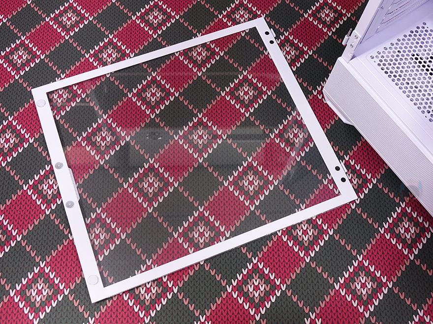 NX416L PC케이스의 사이드 패널은 전면시 왼쪽 패널은 강화유리가 적용되어 있는데, 도어 방식으로 앞부분에 손잡이 디자인이 적용되어 있으며, 안쪽에는 자석방식으로 고정되도록 위아래 각각 자석이 적용되어 있죠. 또한, 힌지 방식으로 패널 분리가 가능하고, 강화유리 영역이 아닌 나머지 아랫부분은 내부 하단 공간의 쿨링효과를 위해 전면처럼 메쉬 디자인을 적용하고 있죠. 참고로 강화유리 두께는 4mm입니다. 그리고, 반대편인 오른쪽 패널은 일반 민무늬 형태에 앞부분에 내부 측면 쿨링효과를 위해 역시 에어홀 처리가 되어 있는데, 패널은 분리해서 안쪽을 보면 자석방식의 먼지 필터도 기본 장착된 것을 확인할 수 있습니다.