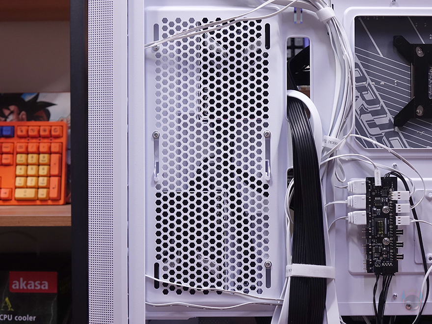 내부 후면 그러니깐 메인보드 트레이 후면을 살펴보면, CPU-cut-Out 바로 아래에는 팬 컨트롤러 허브가 장착되어 있는데, 팬만 연결되는게 아니고 ARGB도 함께 컨트롤할 수 있게 지원하고 있습니다. 허브 기판 왼쪽에는 ARGB 커넥터가 6개, 오른쪽에는 팬 커넥터가 6개로 총 6개의 팬을 연결해서 하나로 컨트롤할 수 있습니다. 그리고, 허브 바로 오른쪽에는 추가로 2.5인치 HDD/SSD를 1개 장착할 수 있는데 브라켓이 장착되어 있으며, 손나사를 풀면 쉽게 분리가 되고, 허브를 사용하지 않는다면, 분리시킨 후 브라켓을 수평 방향으로 장착해서 사용할 수도 있습니다. 그리고, 트레이 윗부분 선정리-홀의 공간 같은 경우에는 홈-처럼 안쪽으로 한 번 들어간 형태로 좀 더 넓은 공간의 케이블 정리공간을 확보하고 있는데 약 30mm 깊이를 가졌죠.