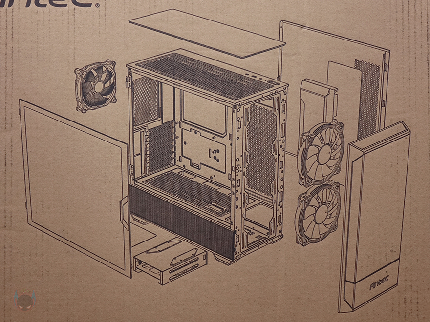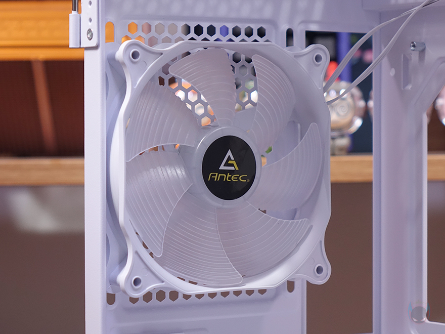 외형부터 살펴보면, 전면 베젤은 절반이상의 면적이 메쉬 디자인을 적용하고 있습니다. 그리고, 간접적으로 내부에 팬이 2개 기본 장착된 것도 확인할 수 있고, 메쉬 부분이 아닌 아랫부분에는 심플하게 Antec 로고만 새겨놨습니다. 전면 베젤에 버튼이나 포트가 적용되어 있지 않아서 바로 분리도 가능한데, 베젤을 분리하면 방금 언급한 2개의 기본 장착 팬을 확인할 수 있습니다. 이 2개의 팬은 이번 NX416L 모델의 가장 큰 특징이라 할 수 있는데, 바로 160mm 크기의 팬을 사용했기 때문입니다. 10만 원 이하의 PC케이스 제품들을 보면 대부분 120mm나 140mm 팬을 기본 제공하는 경우가 많은데, NX416L은 이보다 큰 160mm 팬을 2개 장착하고 나온 거죠. 특히, 팬 크기는 160mm면서 팬 장착 규격은 120mm와 140mm 2가지 나사홀로 처리되어 있어서 장착 호환성도 높습니다. 물론, 팬은 RGB로 정확히는 ARGB 팬이죠. 참고로 표준 규격의 120mm와 140mm 팬을 사용한다면 3개까지 장착이 가능하고, 수랭쿨러시 라디에이터도 360mm까지 장착이 가능합니다.