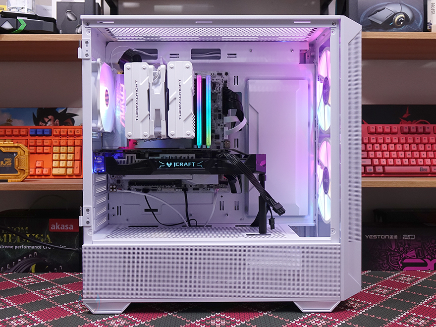 메인보드 후면 공간은 약 24mm 공간을 가지고 있어서 케이블정리를 하는데 큰 어려움은 없으며, 조립 시 한 가지 알아둬야 할 점이라면 측면 커버를 사용할 때 2.5인치 HDD/SSD를 미리 장착해야 하고, 이를 연결하는 SATA 케이블과 파워서플라이 케이블도 미리 저장장치에 연결하고 커버를 장착해야 합니다. 조립 마무리로 전면 160mm 팬 2개와 후면 120mm 팬 1개를 허브에 연결하고 메인보드 ARGB 헤더에 연결한 후, 전원을 켜면 연동되는 RGB 효과를 볼 수 있습니다. 물론, 케이스 상단에 LED 모드 버튼이 있기 때문에 모드 버튼을 통해서도 팬의 다양한 RGB 모드 효과를 볼 수 있죠.