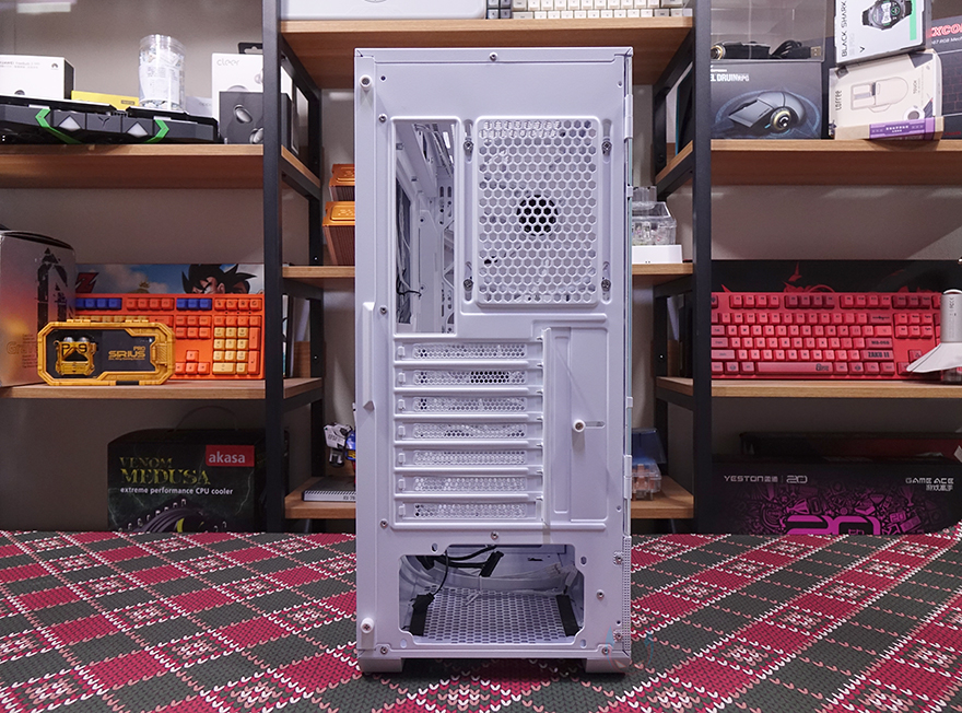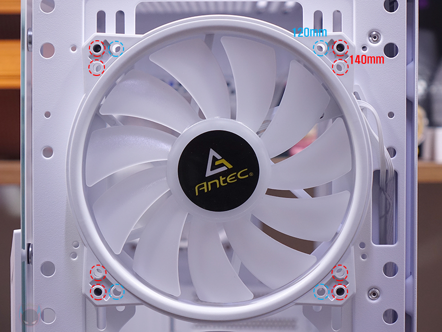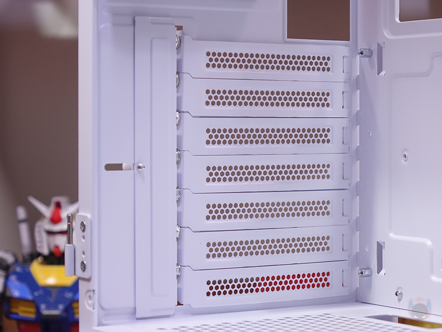 그리고, 내부 하단 공간 역시 커버를 적용했으며, 역시 쿨링효과를 위해 에어홀 처리는 기본이고, 주변으로 케이블 이동시 수월하도록 홀-처리도 해놨으며, 추가로 120mm 팬을 2개 장착할 수 있게 나사홀도 처리되어 있습니다. 내부 후면에는 앞서 외부 후면에서 확인했던 120mm 팬을 확인할 수 있는데, 역시 ARGB 팬이며, 전면 팬과는 달리 좀 더 신속한 공기 흐름을 위해 날개 부분에 나선형 라인 디자인이 적용되어 있습니다. 참고로, 전면과 후면 팬 모두 작동 연결방식은 3핀입니다. 그리고, 아래에 PCI 슬롯 가이드는 모두 재사용이 가능한 탈착식으로 사용되었죠.