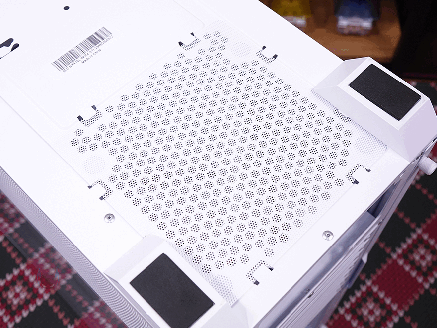 NX416L PC케이스 상단에는 맨 오른쪽 부분에 후방향 일렬로 버튼 및 포트가 배치되어 있는데, 전원 버튼, 리셋 버튼, 작동 상태 LED 램프, MIC/EAR 포트, USB 3.0 포트, USB 타입C 포트순입니다. 그리고, 나머지 영역은 상단 쿨링시스템 지원을 위해 모두 에어홀 처리를 해놨는데, 자석방식의 먼지 필터를 분리하면 쉽게 확인이 되죠. 또한, 에어홀 자리에는 추가로 팬과 수랭쿨러 라디에이터를 장착할 수 있게 지원해주고 있는데, 팬은 120mm 최대 3개, 140mm 최대 2개, 라디에이터는 360mm까지 가능합니다. 특히, 전후방향으로 위치조절을 자유롭게 할 수 있도록 나사홀도 길게 처리되어 있죠.