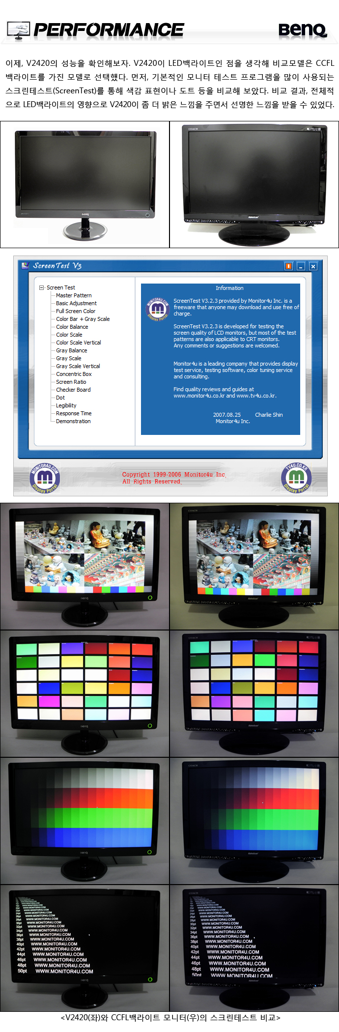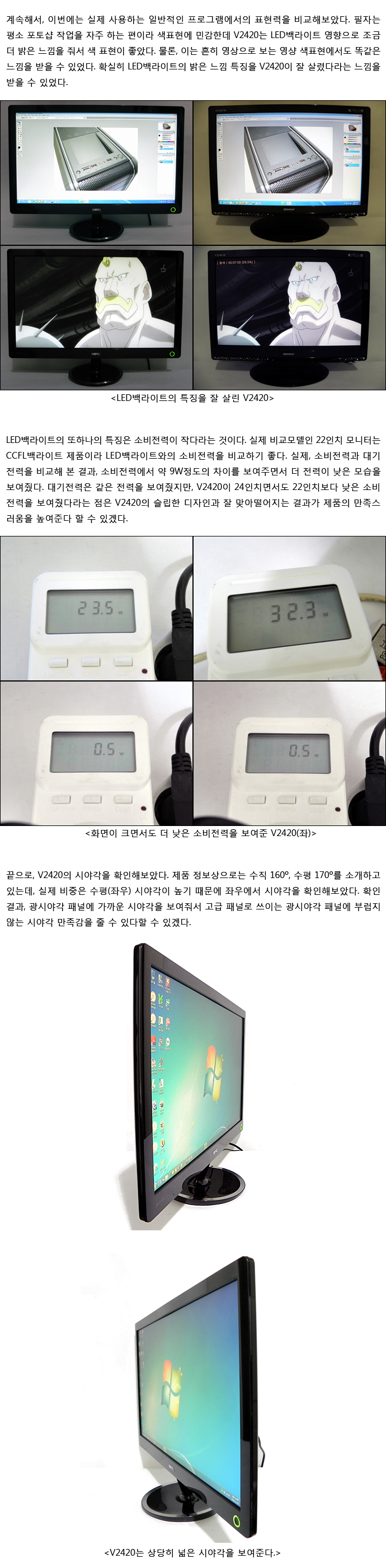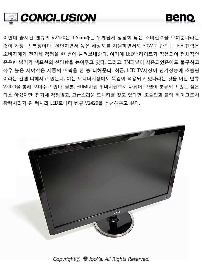 올해 모니터 시장은 LCD에서 LED로 넘어가는 변화를 겪고 있다. TV시장에서 시작된 LED 인기 열풍은 모니터 시장에서도 그대로 적용되고 있다. LED 모니터는 기존 LCD 모니터와 달리 소비 전력이 낮다라는 점에서 인기를 얻고 있는데, 여기에 최근 초슬림이라는 컨셉이 LED에 새롭게 적용되고 있다. 이런 점에서 모니터전문업체 (주)벤큐는 이런 최신 트랜드를 잘 보여주는 모니 터를 출시했다. 바로 V2420이다. LED 모니터에 초슬림이라는 컨셉으로 출시된 벤큐의 V2420을 살펴보도록 하자.