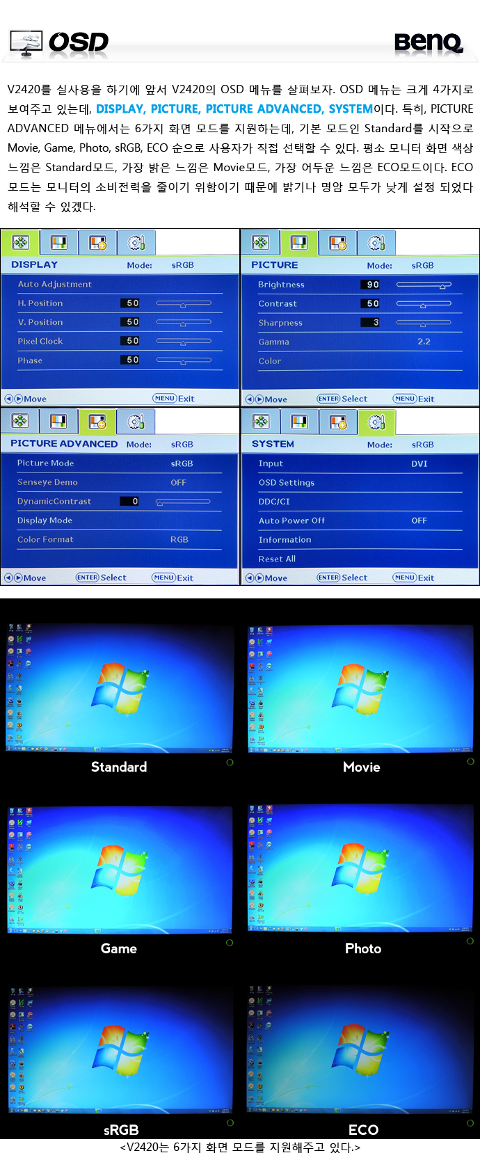 V2420를 실사용을 하기에 앞서 V2420의 OSD 메뉴를 살펴보자. OSD 메뉴는 크게 4가지로 보여주고 있는데, DISPLAY, PICTURE, PICTURE ADVANCED, SYSTEM이다. 특히, PICTURE ADVANCED 메뉴에서는 6가지 화면 모드를 지원하는데, 기본 모드인 Standard를 시작으로 Movie, Game, Photo, sRGB, ECO 순으로 사용자가 직접 선택할 수 있다. 평소 모니터 화면 색상 느낌은 Standard모드, 가장 밝은 느낌은 Movie모드, 가장 어두운 느낌은 ECO모드이다. ECO모드는 모니터의 소비전력을 줄이기 위함이기 때문에 밝기나 명암 모두가 낮게 설정 되었다 해석할 수 있겠다.