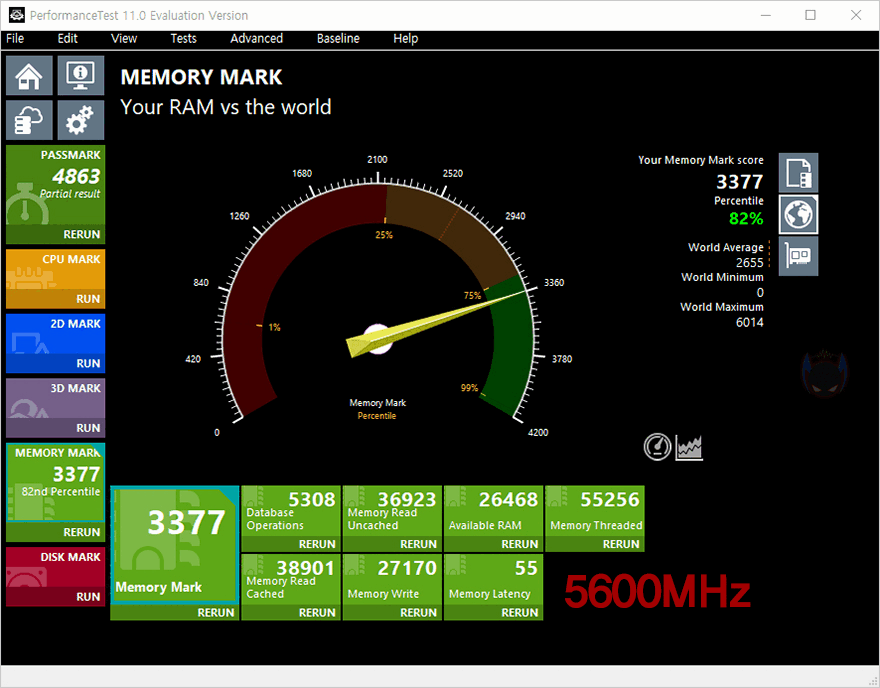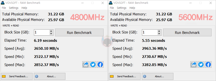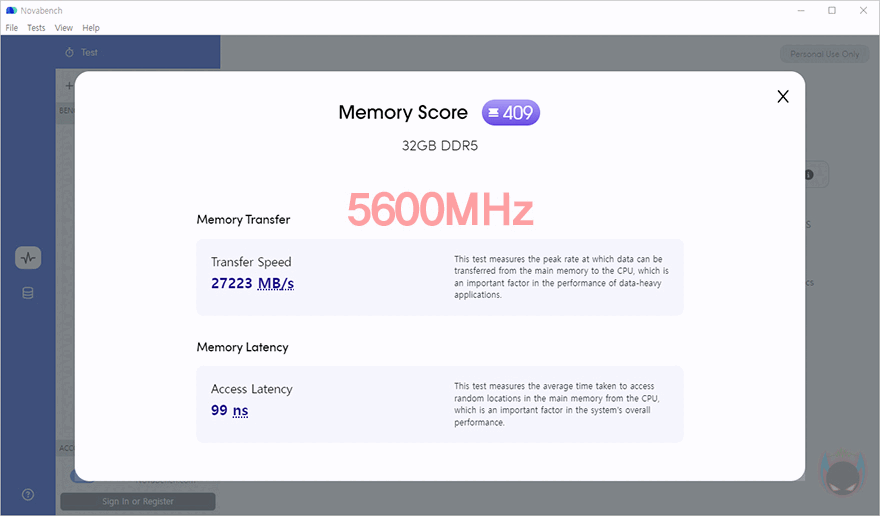 AID64의 Memory Bencharmk를 비롯해, VOVSOFT RAM Benchmark, MaxxMem2, Novabench의 Memory Test, Passmark의 PerformanceTest-Memory Mark까지 총 5개의 메모리 벤치마크 프로그램을 실행한 결과 모두 5600MHz일때의 성능이 앞서는 것을 쉽게 확인할 수 있습니다. 즉, 노트북이나 미니 PC에서 메모리 클럭 지원이 5600 MHz을 지원한다면, 기본작동되는 4800 MHz 클럭 제품보다 5600 MHz 클럭 제품을 사용하는 게 분명 성능 향상에는 도움이 된다는 거죠. 충분히 KingBank SO-DIMM DDR5도 그 부분을 그대로 보여줍니다.