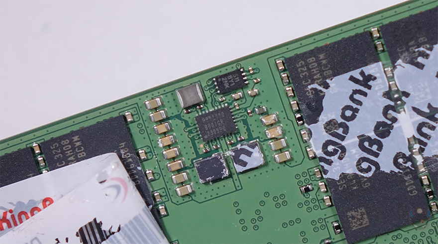그럼, KingBank SO-DIMM DDR5 메모리를 살펴보면, 노트북/미니PC에 사용되는 제품이기 때문에 데스크톱 PC메모리처럼 방열판 같은 부착은 없습니다. 쉽게 말해, 메모리의 가장 기본형태를 가지고 있죠. PCB 기판도 가장 기본이 되는 녹색색상입니다. 그리고, 한쪽 면에만 메모리 모듈이 적용된 단면 메모리 형태이고, 라벨 부분에는 클럭과 용량 표기를 확인할 수 있죠. 참고로, 라벨 스티커를 흔적이 남는 씰링 스티커이며, 스티커를 제거하면, 메모리 모듈 외에 DDR5에서부터 적용되는 HBM 기술에 따른 PMIC칩이 중앙에 적용된 것을 확인할 수 있습니다.