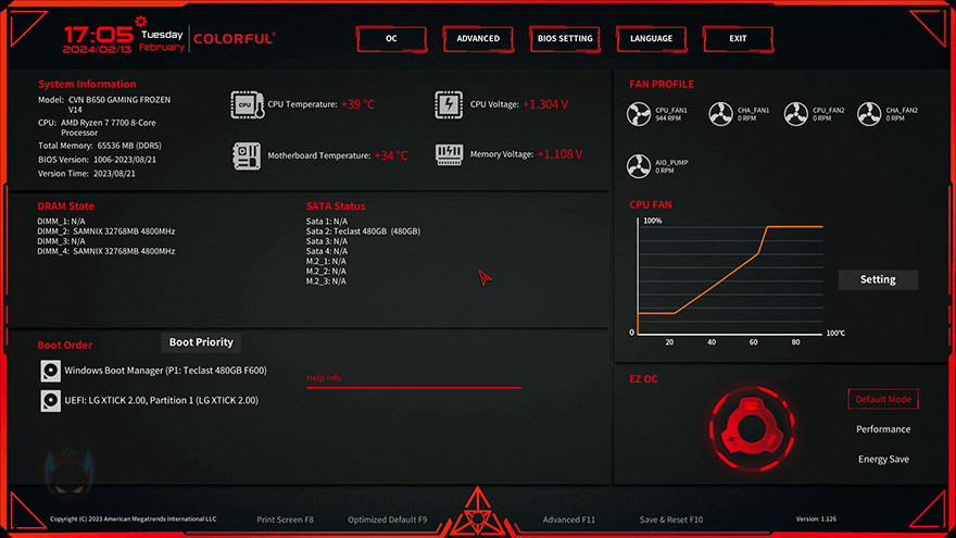 CVN B650 Gaming Frozen V14 메인보드의 CMOS 화면은 기존 CVN 시리즈 메인보드들과 큰 차이가 없습니다. 메뉴는 크게 OC, Advanced, BIOS Setting, Language, Exit 5가지로 갖추고 있으며, CPU와 메모리(RAM) 오버클럭을 위해선 OC 메뉴에서 설정하면 되고, 전압설정 등의 전력관리는 Advanced 메뉴에서 진행하면 되죠. 물론, 나머지 저장장치나 기타 장치 설정도 Advanced 메뉴에서 다룹니다.