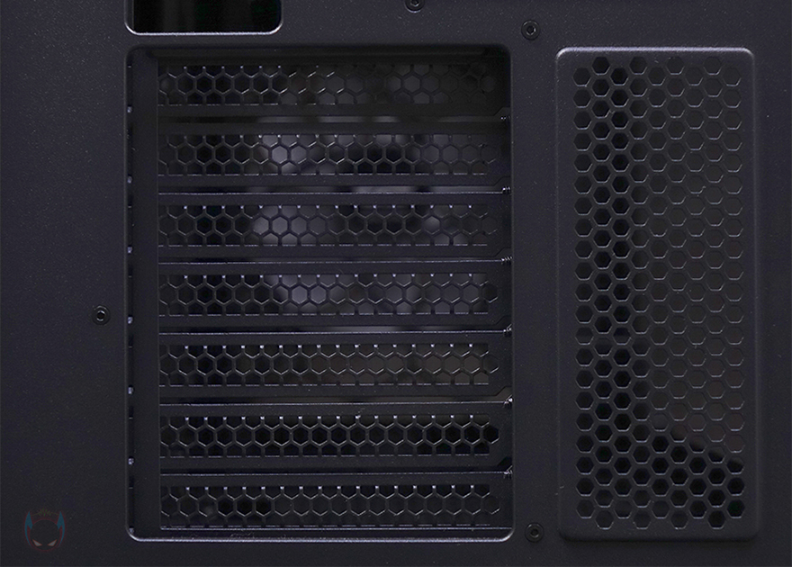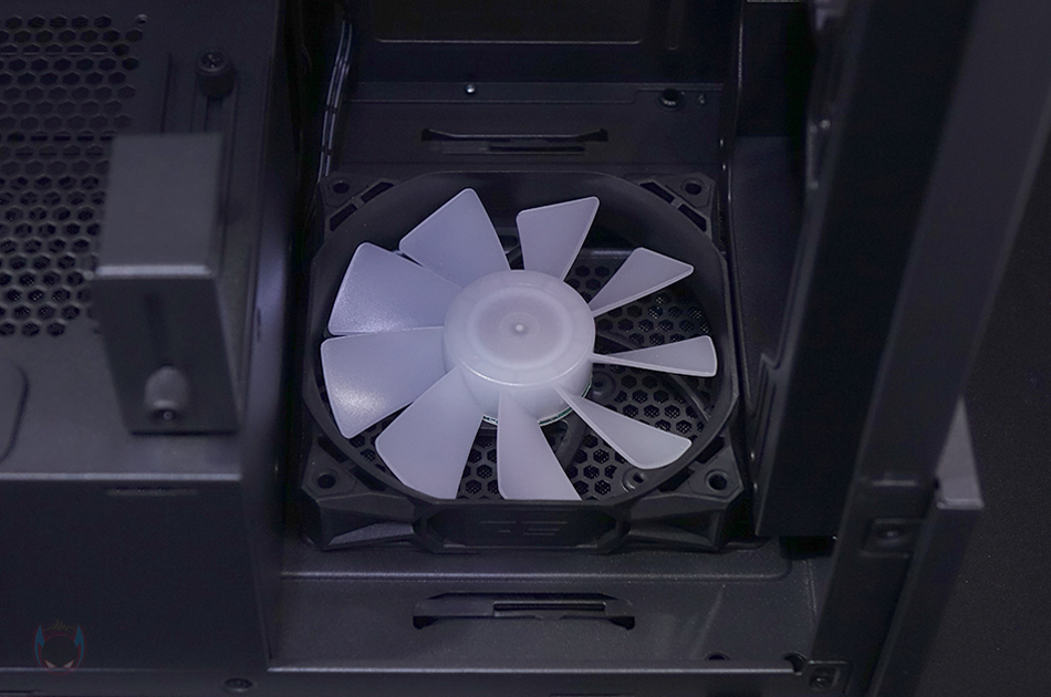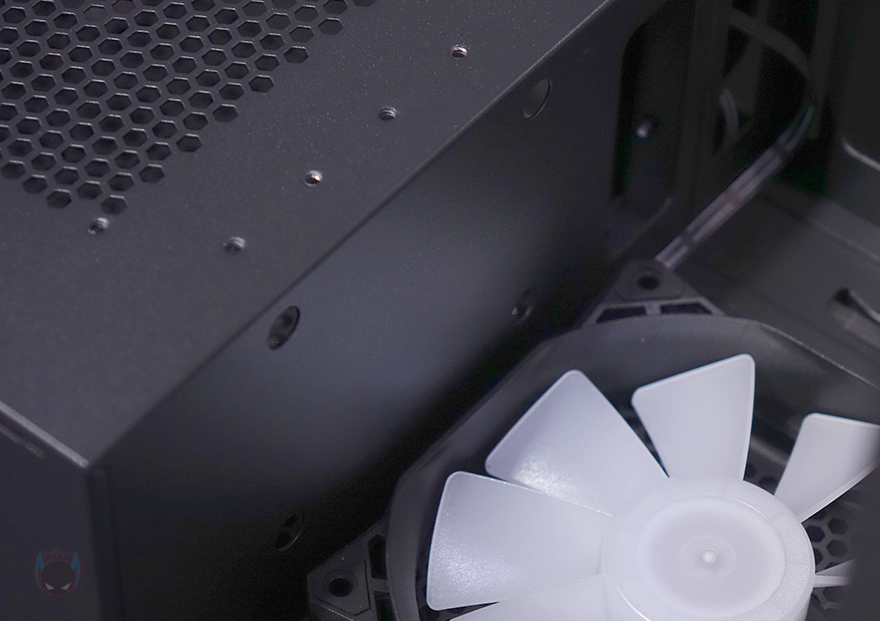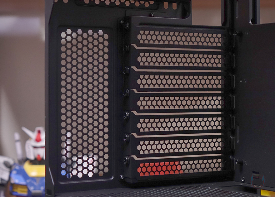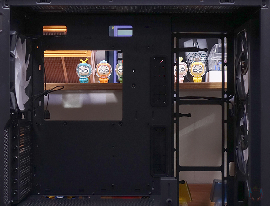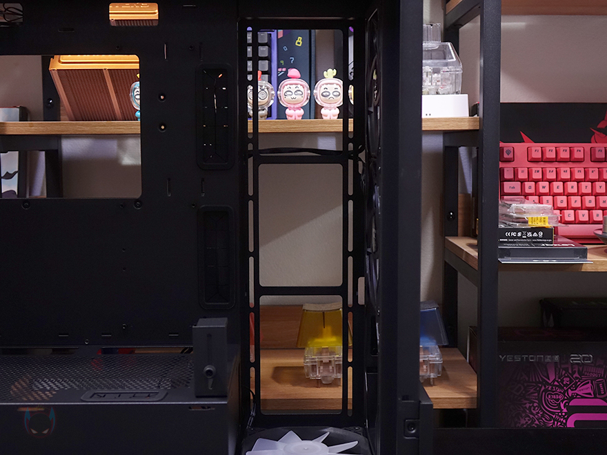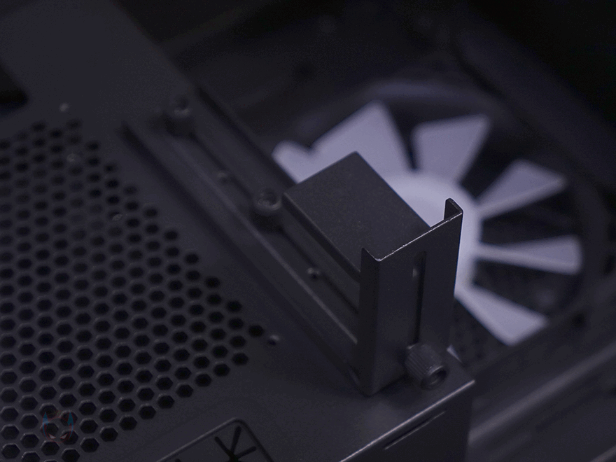 그리고, 내부 하단 PSU 커버 상단에도 에어홀 처리와 선-정리홀을 확인할 수 있는 동시에 역시 내부 쿨링시스템을 갖출 수 있게 나사홀도 처리되어 있는데, 최대 120mm 팬 2개를 장착할 수 있습니다. 그리고, 커버 맨 오른쪽에는 그래픽카드 지지대도 기본 제공해주고 있는데, 모두 손나사를 사용해 위아래 위치조절과 지지대 앞뒤 조절을 쉽게 할 수 있도록 했습니다. 참고로 지지대 기본 장착 방향은 가로로 되어있지만, 분리해서 세로 방향으로 세워서 사용할 수도 있습니다. 그리고, 내부 후면에는 앞서 외부에서 확인한 배기역할의 140mm 팬을 확인할 수 있는데, 역시 ARGB 팬이며, 아래에 PCI슬롯 가이드는 모두 재사용이 가능한 착탈식을 사용했습니다.