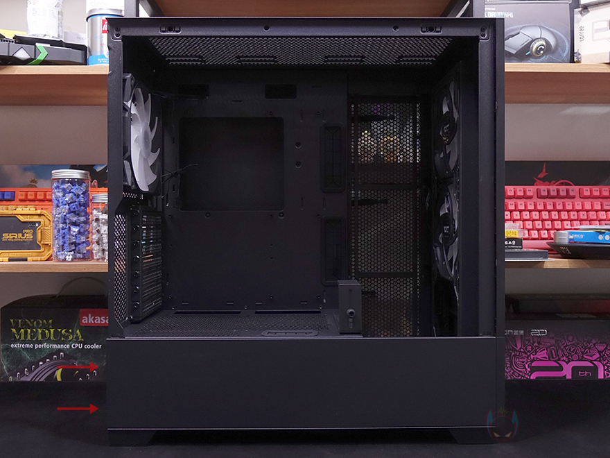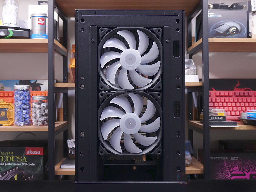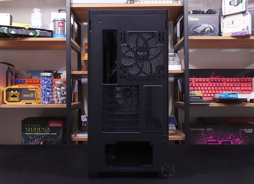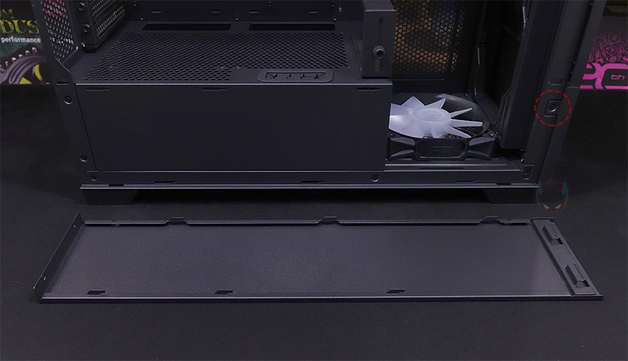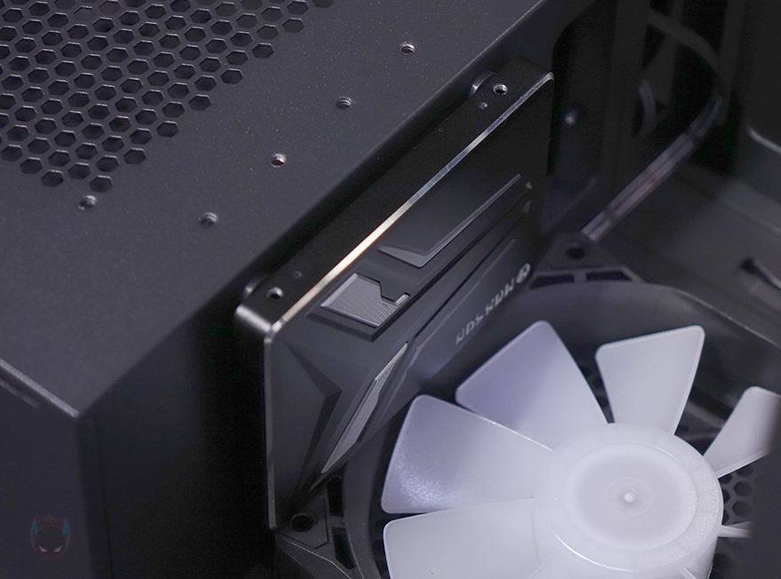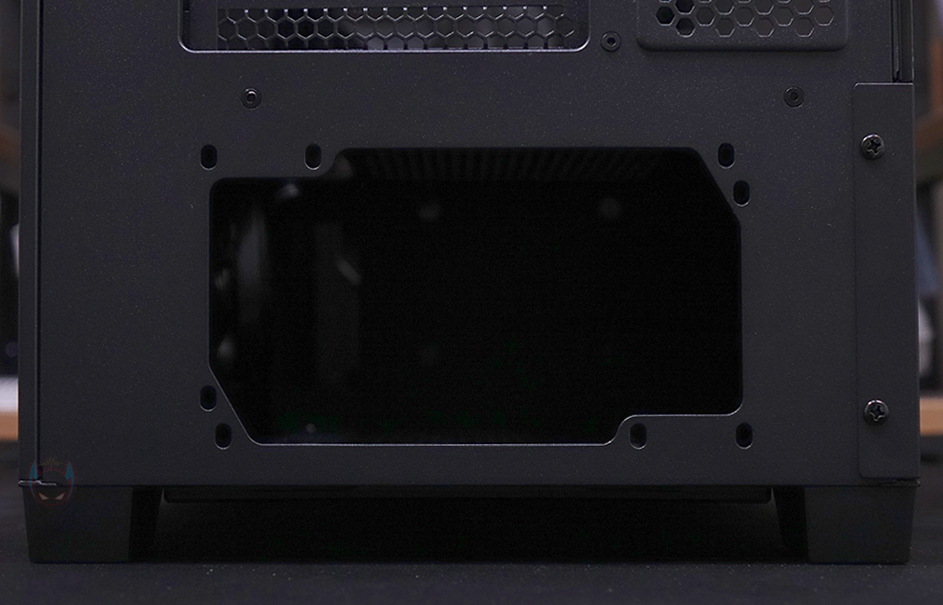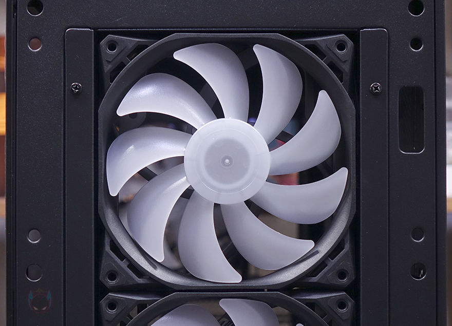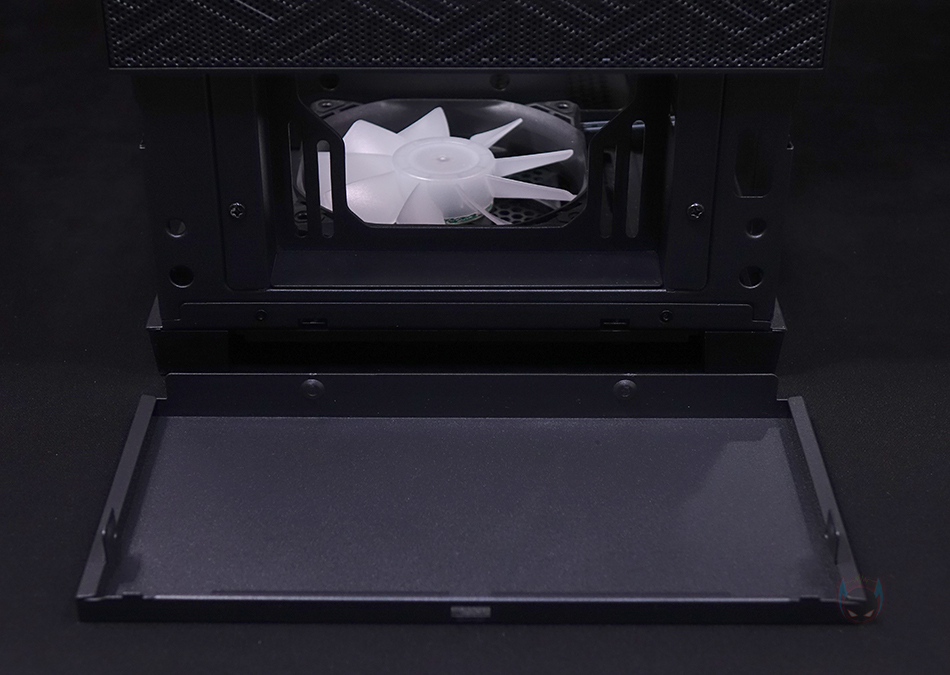 그리고, 내부 하단 PSU 커버 상단에도 에어홀 처리와 선-정리홀을 확인할 수 있는 동시에 역시 내부 쿨링시스템을 갖출 수 있게 나사홀도 처리되어 있는데, 최대 120mm 팬 2개를 장착할 수 있습니다. 그리고, 커버 맨 오른쪽에는 그래픽카드 지지대도 기본 제공해주고 있는데, 모두 손나사를 사용해 위아래 위치조절과 지지대 앞뒤 조절을 쉽게 할 수 있도록 했습니다. 참고로 지지대 기본 장착 방향은 가로로 되어있지만, 분리해서 세로 방향으로 세워서 사용할 수도 있습니다. 그리고, 내부 후면에는 앞서 외부에서 확인한 배기역할의 140mm 팬을 확인할 수 있는데, 역시 ARGB 팬이며, 아래에 PCI슬롯 가이드는 모두 재사용이 가능한 착탈식을 사용했습니다.