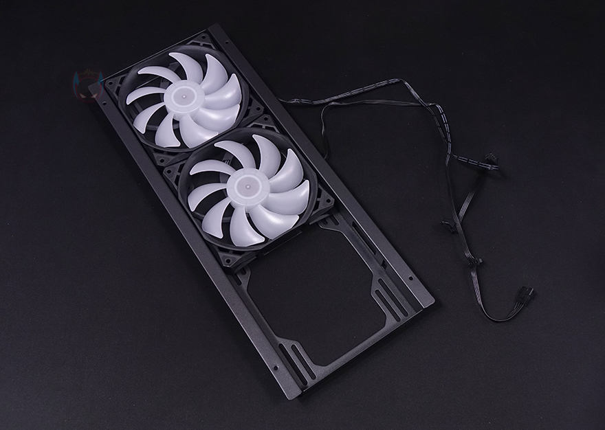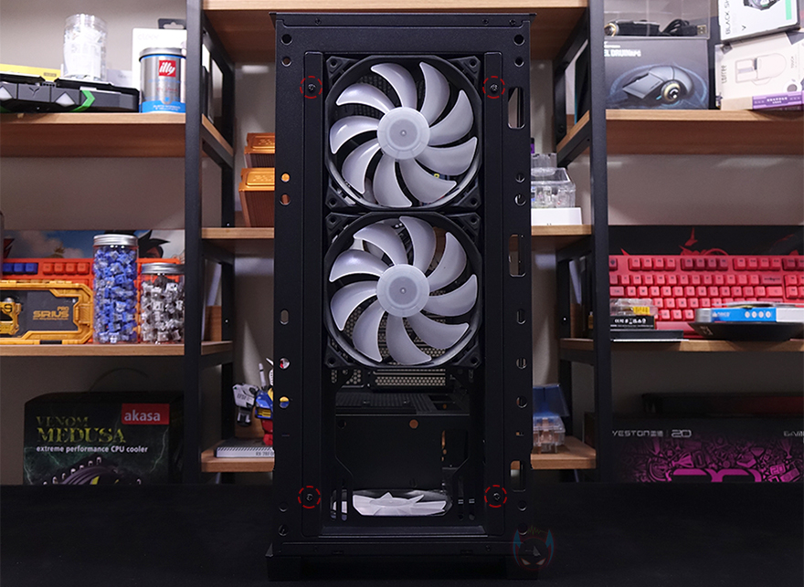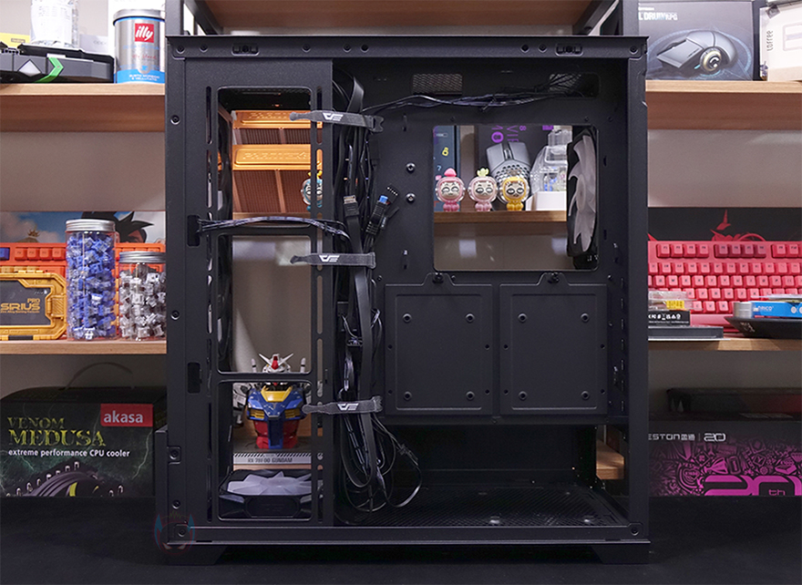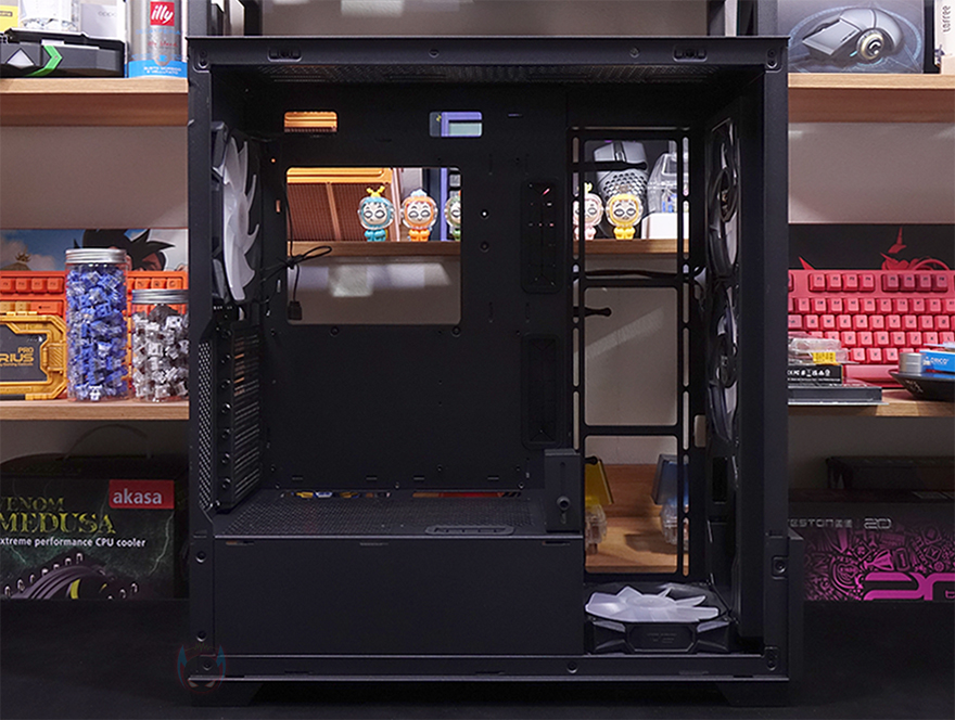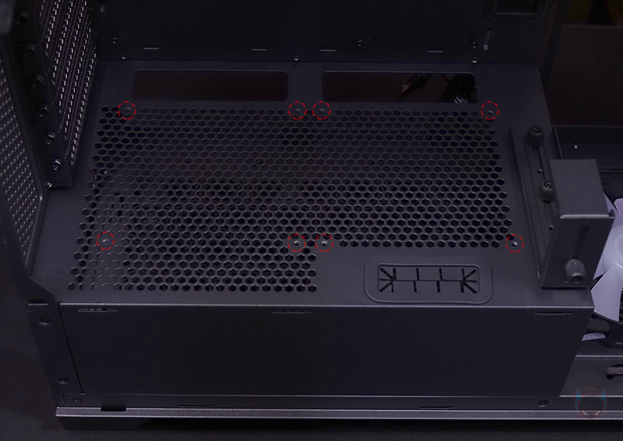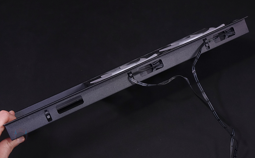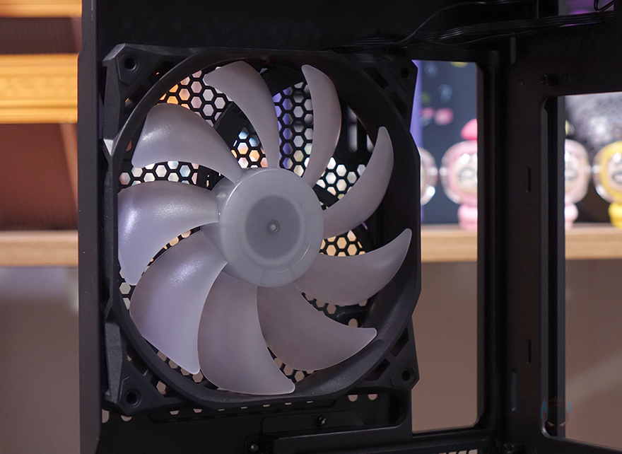 그리고, 내부 하단 PSU 커버 상단에도 에어홀 처리와 선-정리홀을 확인할 수 있는 동시에 역시 내부 쿨링시스템을 갖출 수 있게 나사홀도 처리되어 있는데, 최대 120mm 팬 2개를 장착할 수 있습니다. 그리고, 커버 맨 오른쪽에는 그래픽카드 지지대도 기본 제공해주고 있는데, 모두 손나사를 사용해 위아래 위치조절과 지지대 앞뒤 조절을 쉽게 할 수 있도록 했습니다. 참고로 지지대 기본 장착 방향은 가로로 되어있지만, 분리해서 세로 방향으로 세워서 사용할 수도 있습니다. 그리고, 내부 후면에는 앞서 외부에서 확인한 배기역할의 140mm 팬을 확인할 수 있는데, 역시 ARGB 팬이며, 아래에 PCI슬롯 가이드는 모두 재사용이 가능한 착탈식을 사용했습니다.